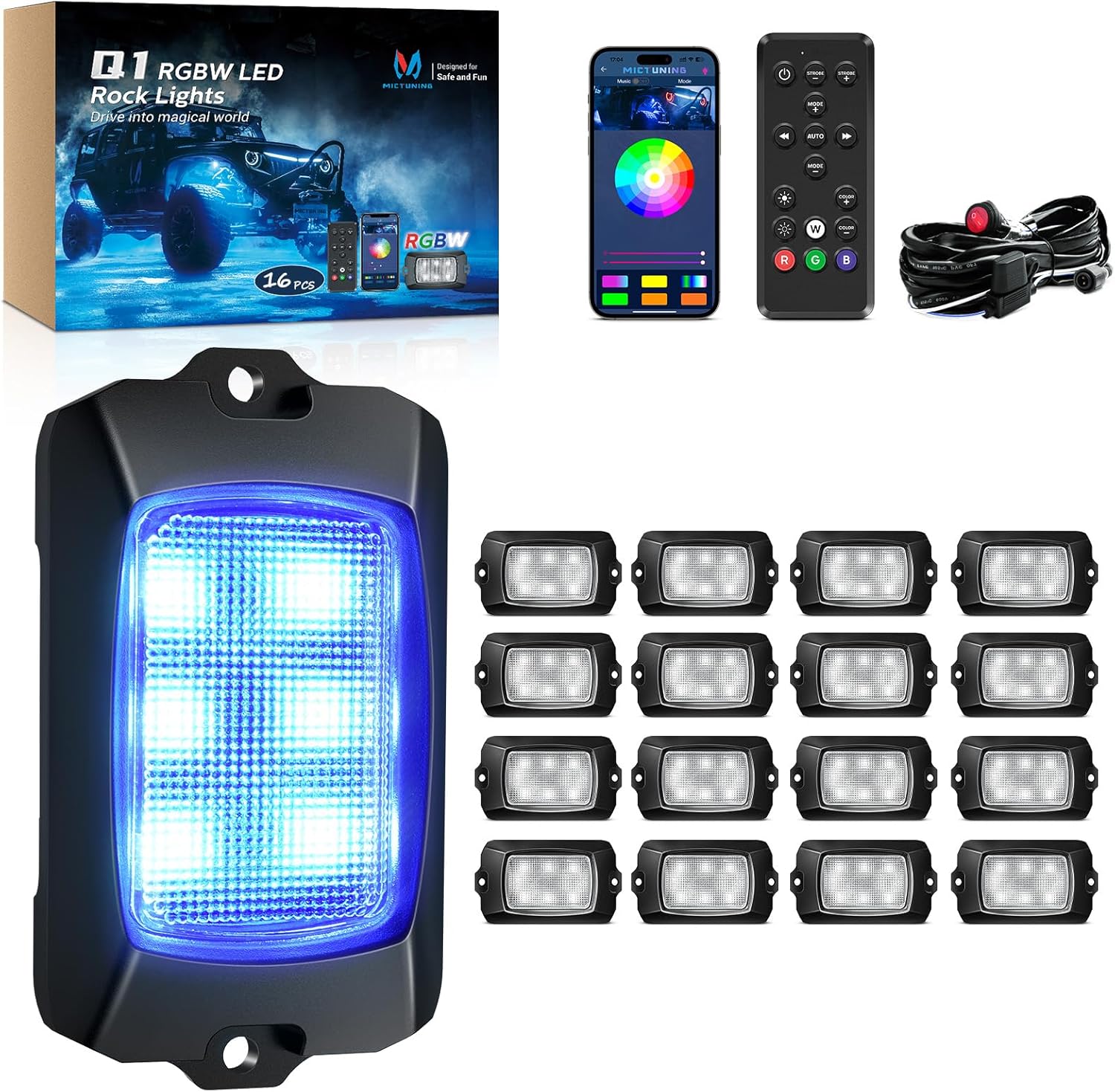 MICTUNING Q1 RGBW LED Rock Lights, 16 Pods Pure Color Underglow Neon Multicolor Lighting with Wiring Switch Kit, Bluetooth Controller, Remote Control, Music Mode for Trucks Car ATV UTV Golf Cart