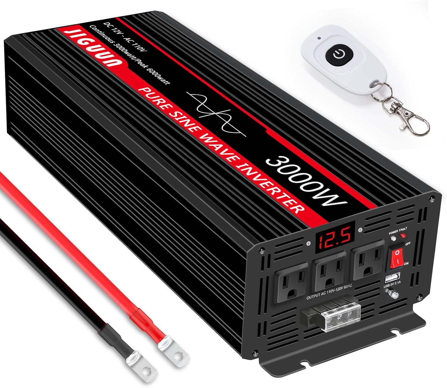JIGUUN 3000 Watt Pure Sine Wave Inverter, Power Converter 12V DC to 110v/120v AC, Car Inverter with 4 AC Outlets& USB Port Remote Control for RV Camping Truck.