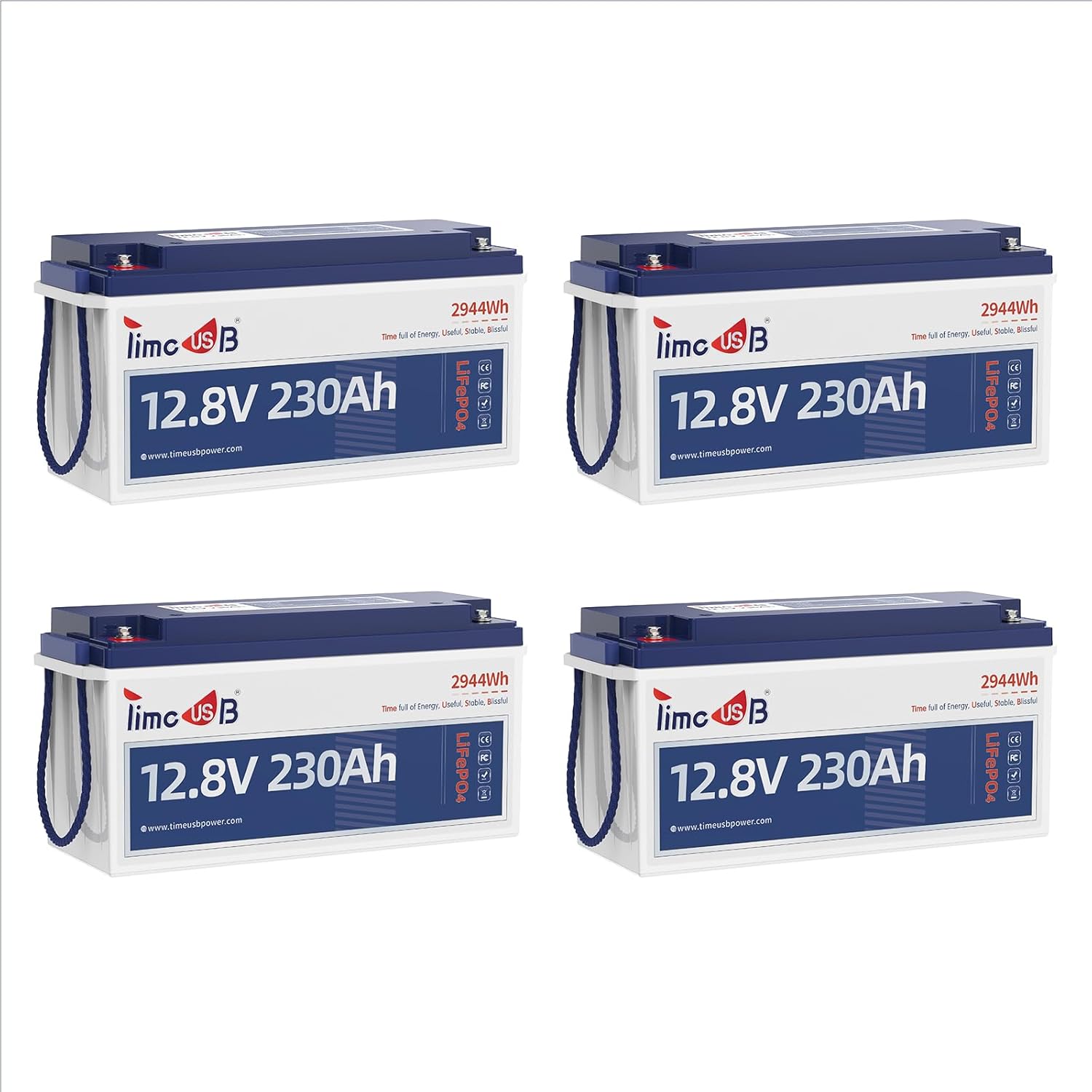 Timeusb 4 Pack 12V 230Ah LiFePO4 Battery, Built-in 150A BMS, Max. 1920W Power Output & 2944Wh Energy Lithium Battery, 15000 Cycles for Your RVs, Solar System, Off-Grid, Camper, etc