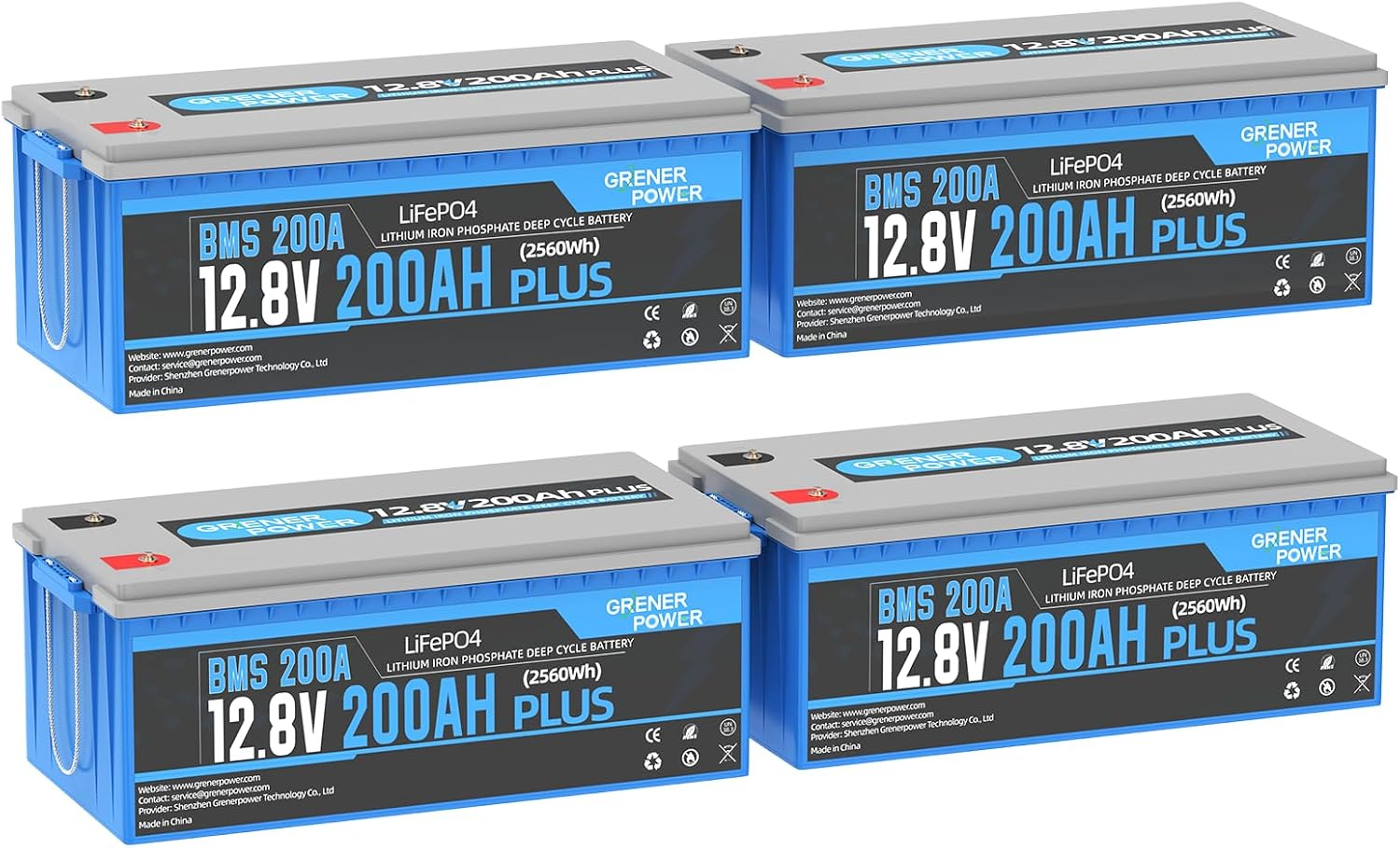 4 Pack 12.8V200Ah Plus Lithium Battery, 200A BMS, Max. 2560W Power Output, 4000-15000 Deep Cycles Lithium Battery, 10-Year Lifetime, Perfect for RV, Camping, Marine, Solar Off Grid