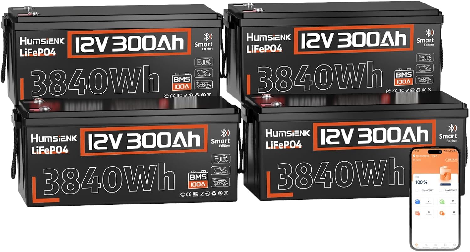 48V 300Ah (4 PACK 12V 300Ah) Battery LiFePO4 Lithium Built-in 100A BMS Bluetooth, 15000 Deep Cycles Battery 3840Wh with Low-Temp Protection for RV Marine Home Energy Storage Off-Grid Living