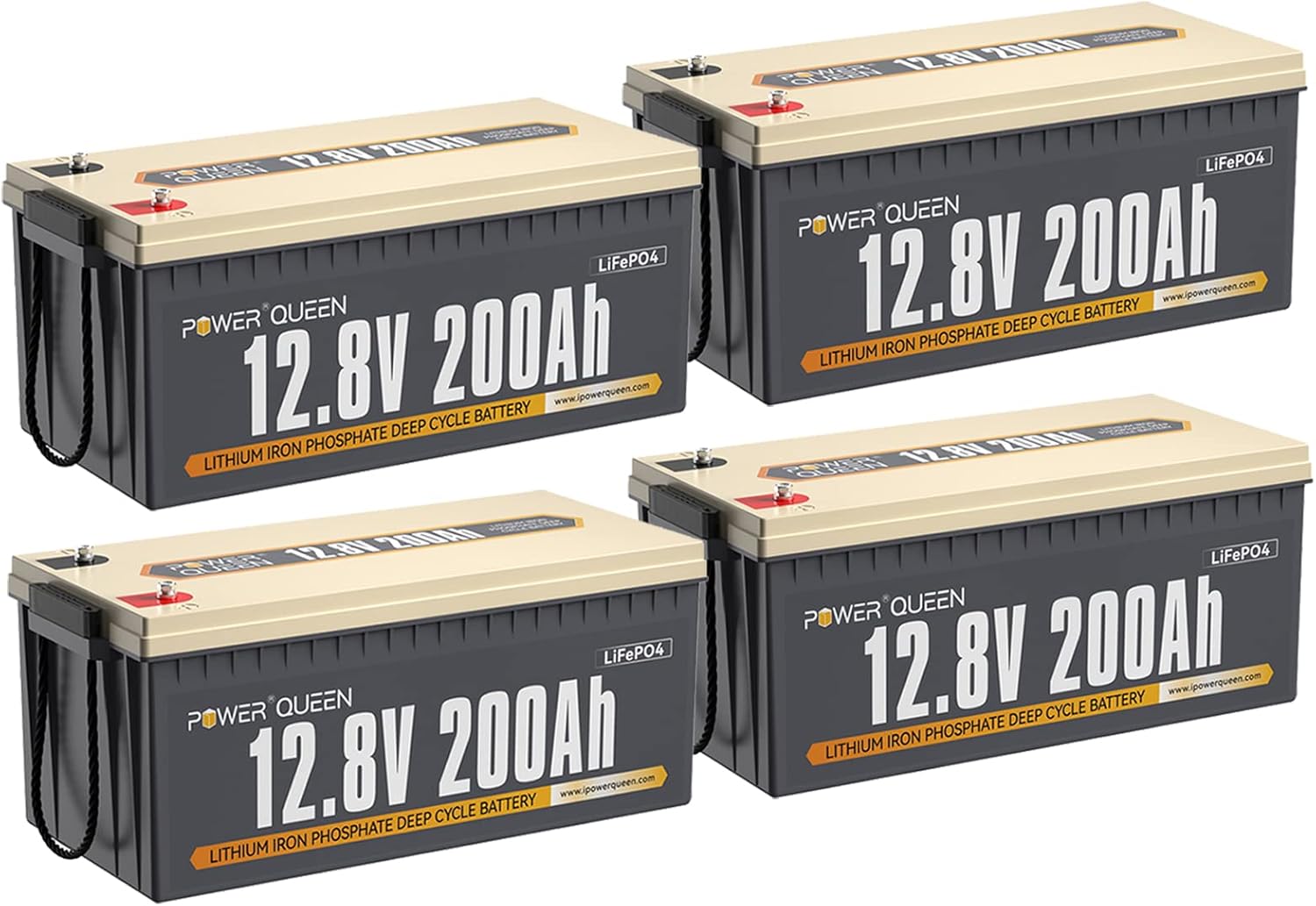 Power Queen 4Pack of LiFePO4 Battery 12.8V200Ah, Built-in 100A BMS, Max 2560Wh, Up to 15000+ Cycles, Support in Series/Parallel, Widely Used in Home Solar System, RV Camping, Off-Grid Power