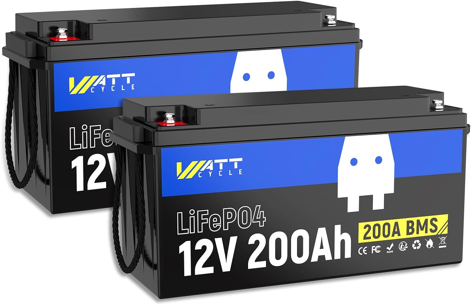 Wattcycle 12V 200Ah LiFePO4 Battery 2 Pack - Parallel/Serial Configuration - Deep Cycle - 15000 Cycles - Built-in 200A BMS - Ideal for RV, Home Energy Storage - Pack of 400Ah.