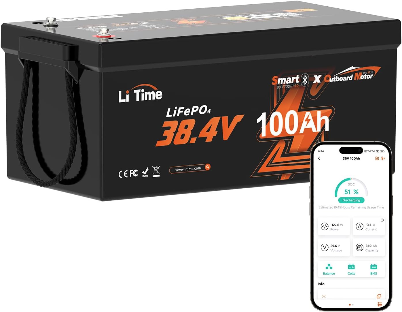 LiTime 36V 100Ah OBM Bluetooth Low-Temp Protection LiFePO4 Battery, Built-in 100A BMS, Deep Cycle Lithium Iron Phosphate Battery Perfect for Trolling Motors, Yachts, Marine, Boats, RV, Home