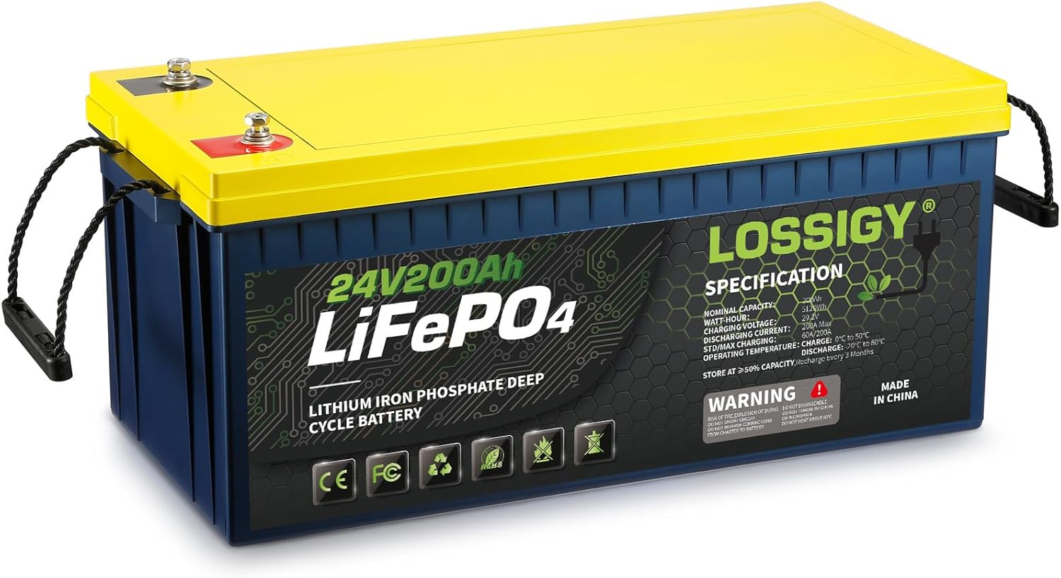 LOSSIGY 24V 200AH LiFePO4 Lithium Battery, Built in 200A BMS, 5.12KW with 10 Yrs Lifespan, Perfect for Trolling Motor, Solar System, RV, Marine