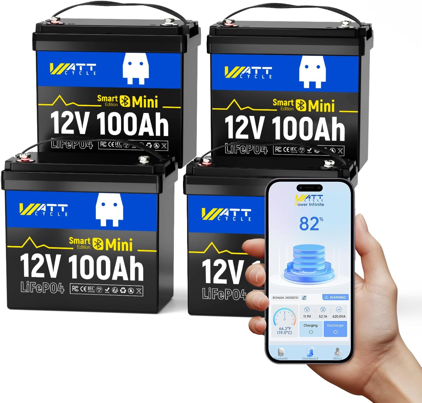 WattCycle 12V 100Ah LiFePO4 Lithium Battery with Bluetooth BCI Group 24 12V Mini Batterys 100A Smart BMS Support Monitoring Battery via Phone Bluetooth 15000 deep Cycles Marine Trolling Motor RV