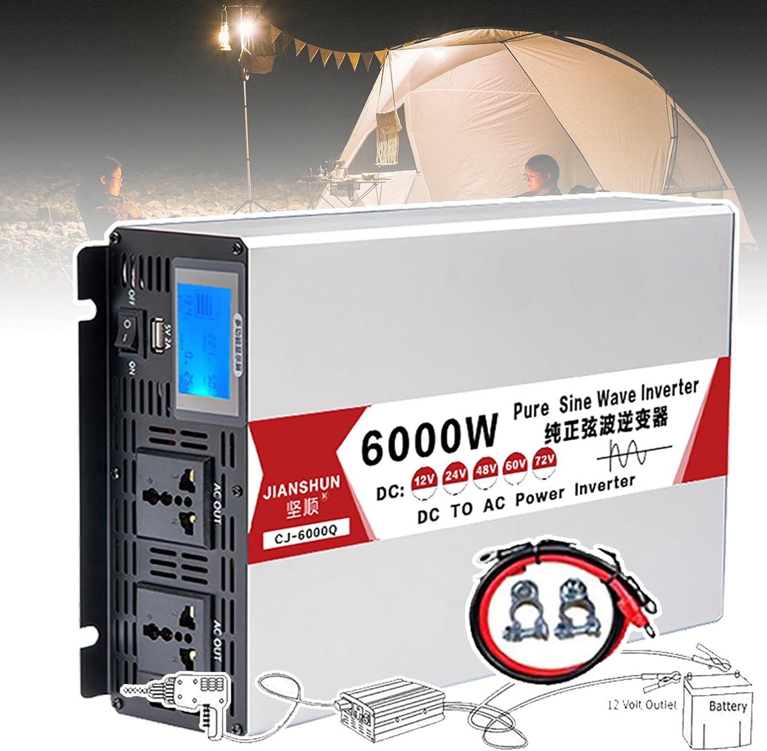 Pure Sine Wave Power Inverter - Display + USB Port + 2 Universal, 12V/24V/48V/60V DC to 110V/220V AC Converter - Multiple Protection, Car/Truck/RV,6000W-24V