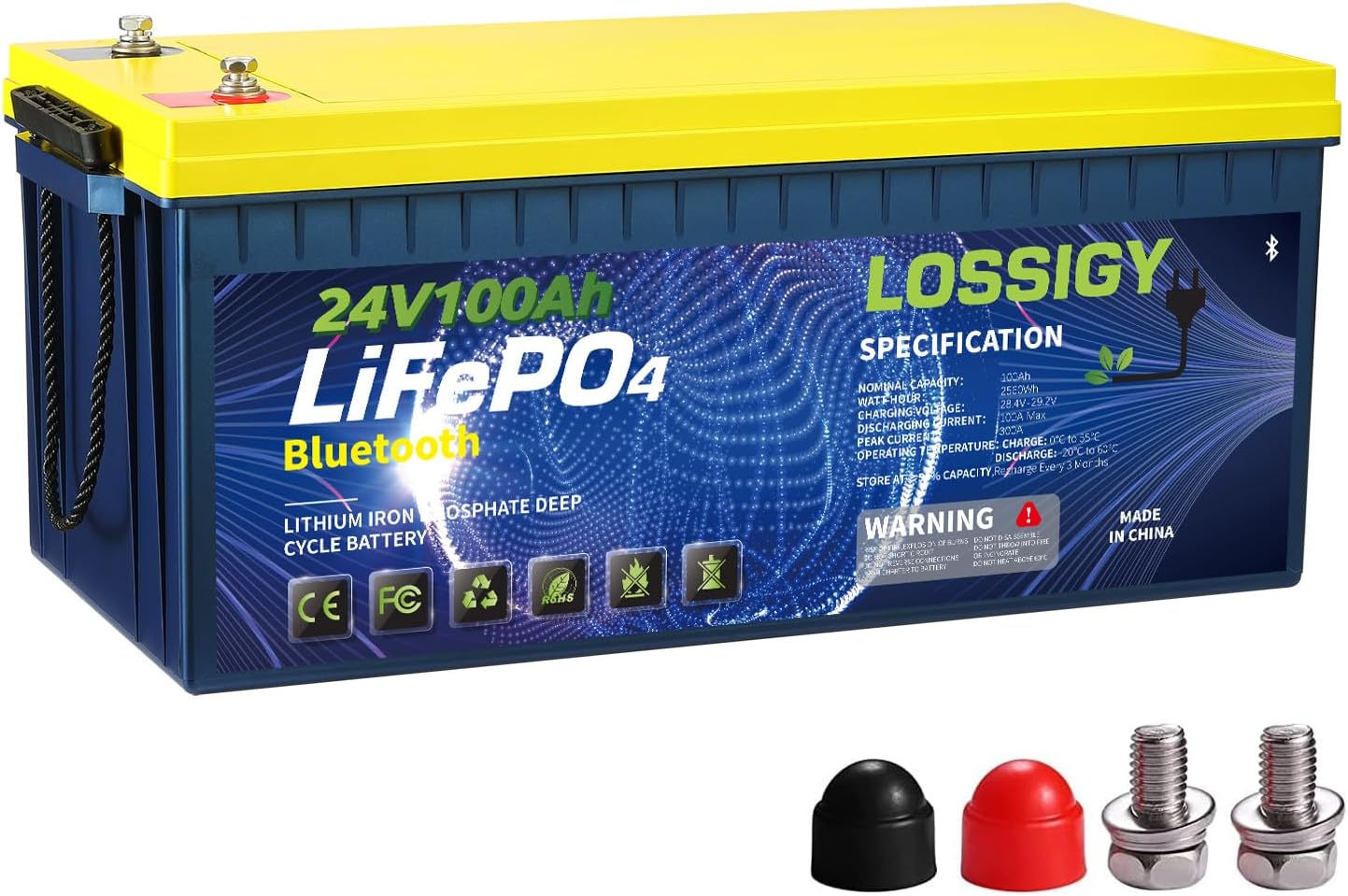 LOSSIGY 24V 100Ah Lithium Battery - 2560Wh, Built-in 100A BMS with Bluetooth, Deep Cycle Power Supply for Solar System, RV, Off-Grid, Marine, Trolling Motor
