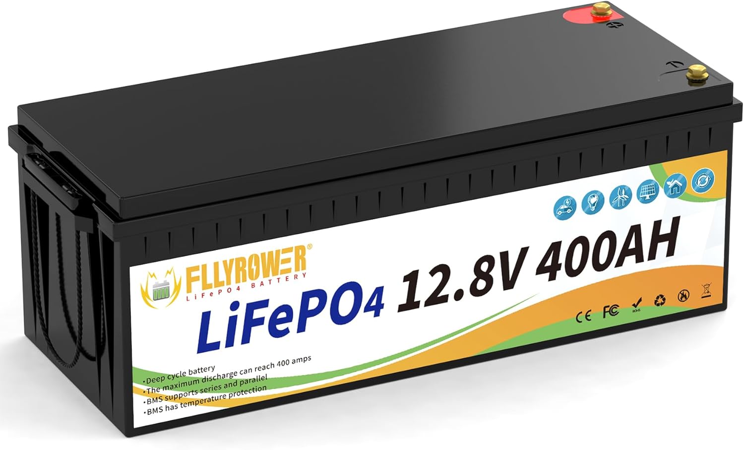 FLLYROWER 12V Lithium Battery 400AH with BMS and 16500 Deep Cycles 12V 400AH Lifepo4 Battery Grade A Cells for Marine Trolling Motor RV Camping Solar Golf Cart Off-Grid