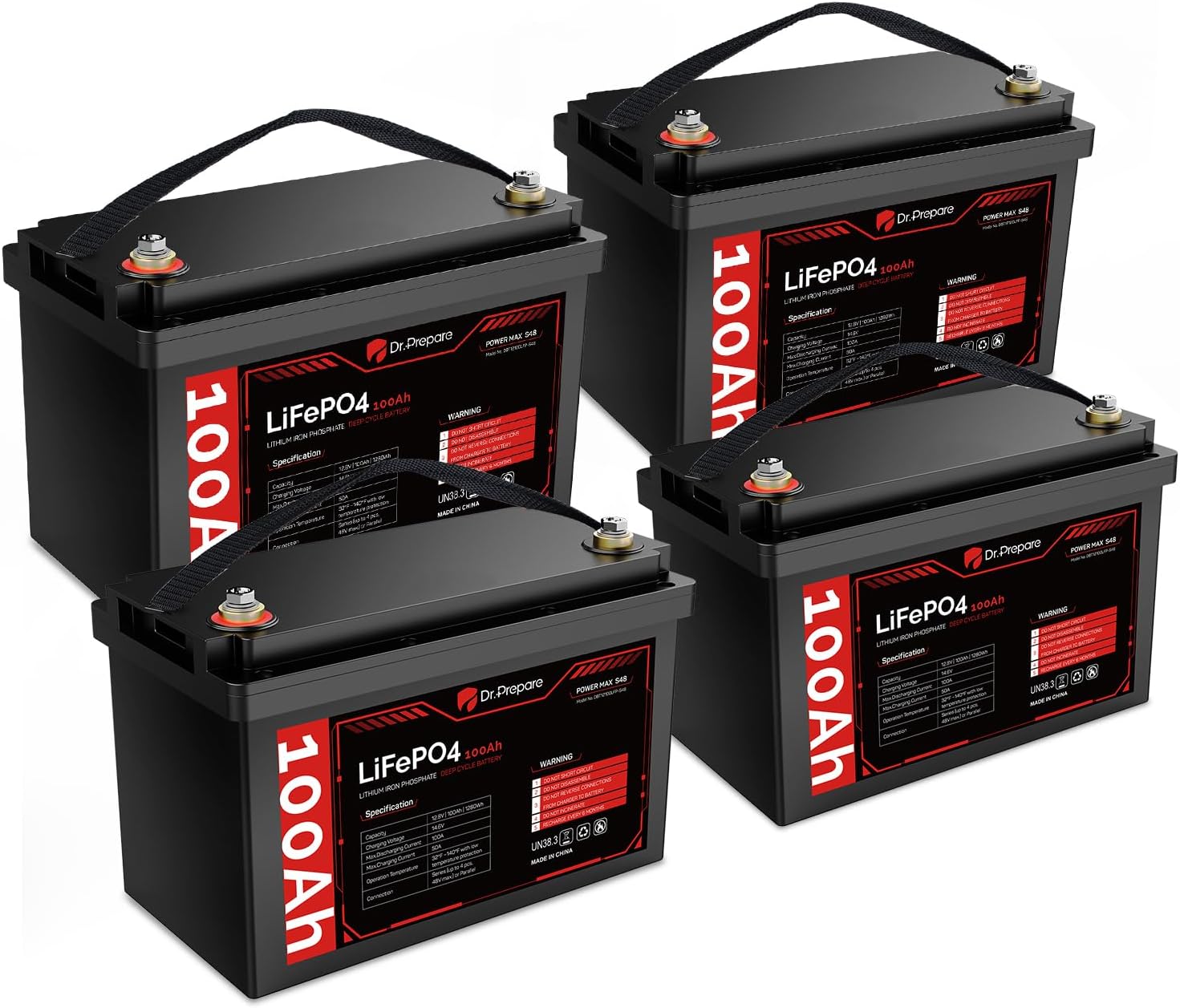 DR.PREPARE 12V 100Ah LiFePO4 Battery (4 Pack), Group 31 Lithium Batteries in Series/Parallel, 100A BMS, Deep Cycle Lithium Iron Phosphate Battery for RV, Trolling Motor, Solar Power, Off Grid