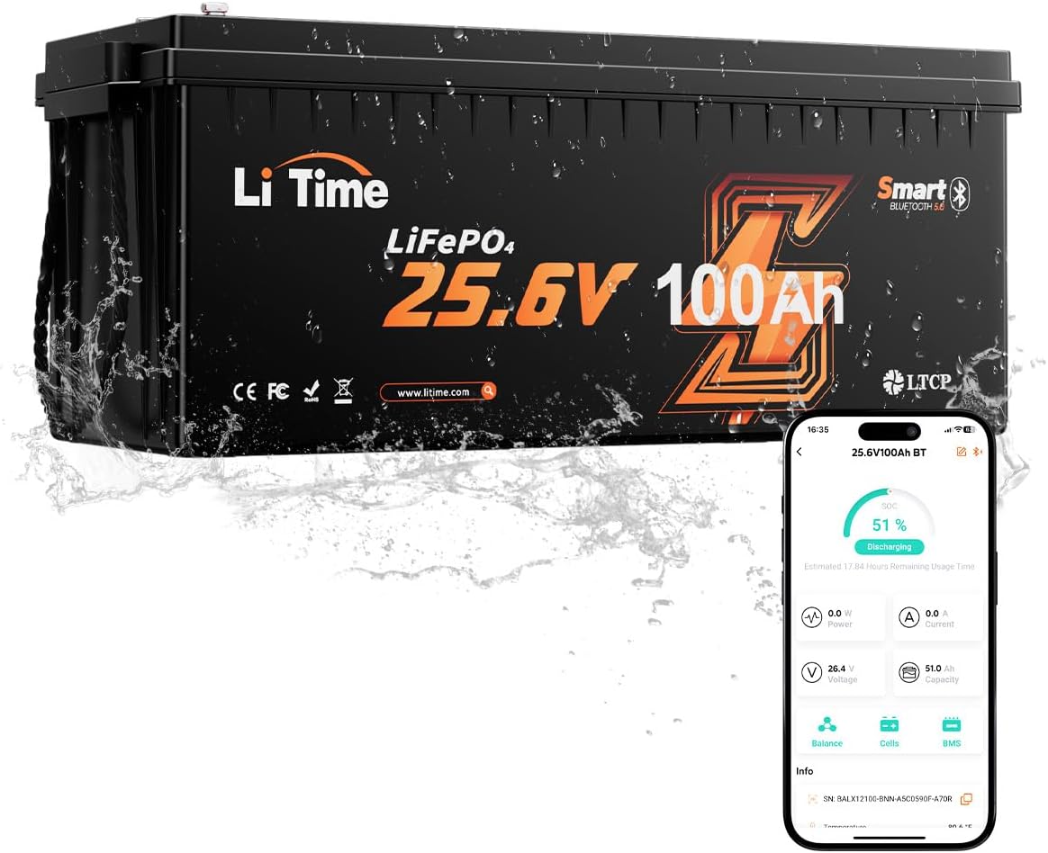 LiTime 24V 100Ah LiFePO4 Lithium Battery, Bluetooth 5.0, Low-Temp Cutoff Protection, 4000+ Deep Cycles, Built-in 100A BMS for Marine, Trolling Motors, RVs,Off-Grid