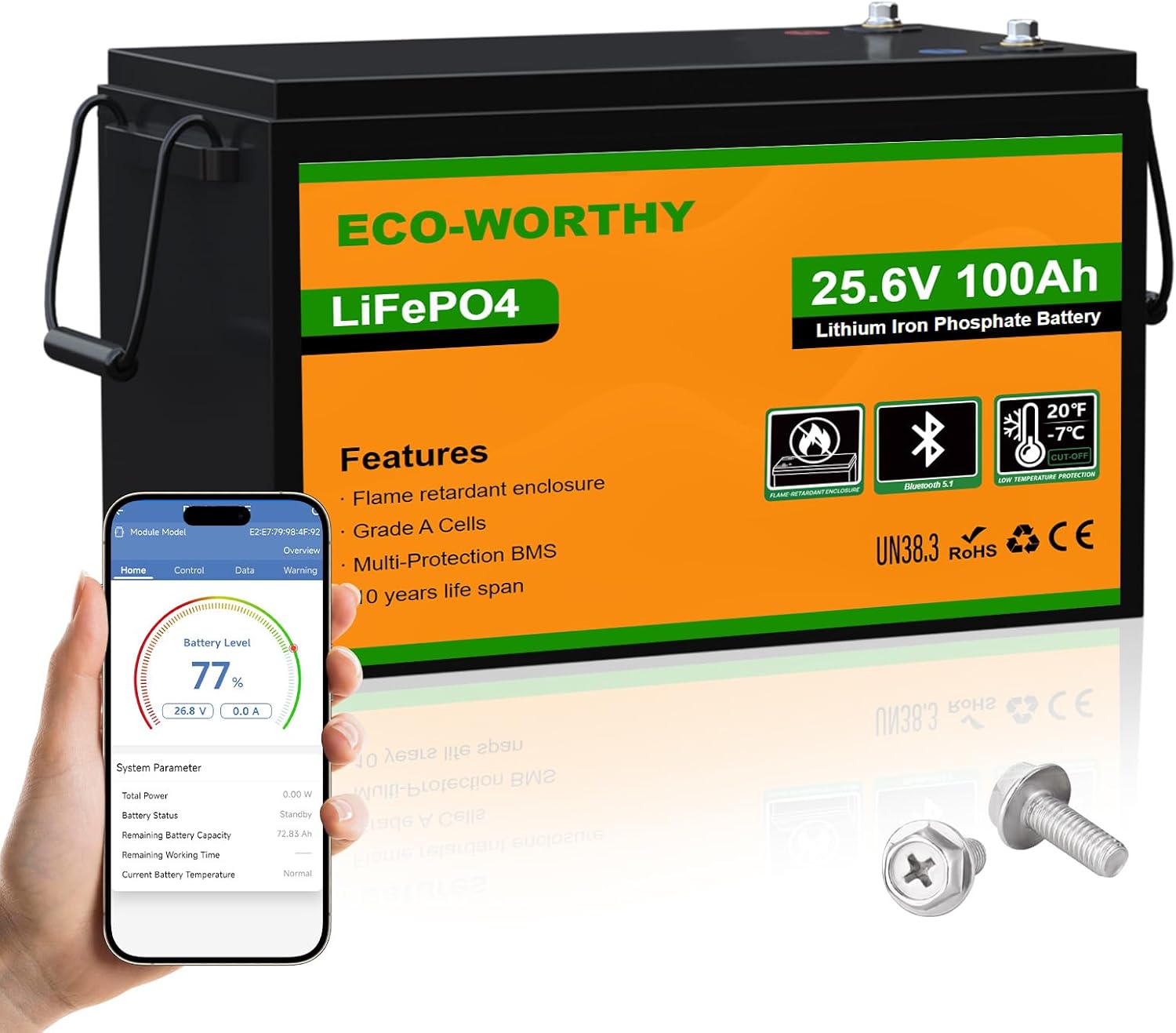 ECO-WORTHY 24V 100Ah LiFePO4 Lithium Battery, Upgraded Bluetooth Version, Deep Cycle Rechargeable Battery with Low-Temp Protection, 2560W Max for Off-Grid Solar, RV, Camper, Trolling Motor, Home Use
