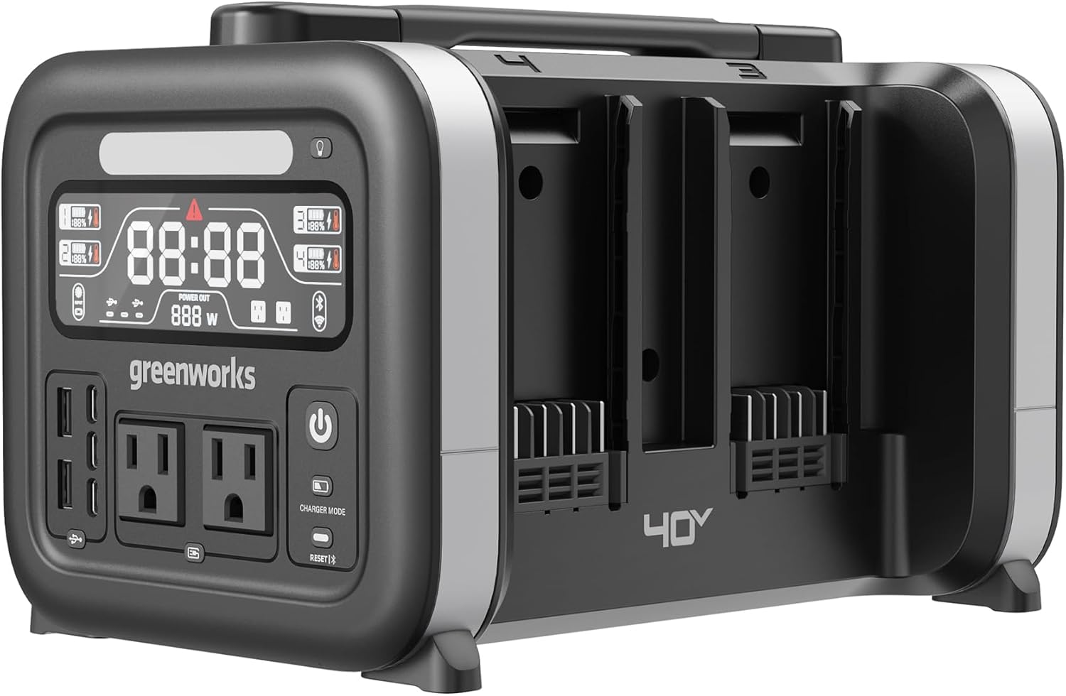 Greenworks 40V 500W Portable Power Inverter, 4-Slot Inverter, 2 AC Outlets, 5 USB Ports, Smart APP Control Power Generator, Outdoor Backup Power Supply (POWER 75+TOOLS, BATTERY SOLD SEPARATELY)