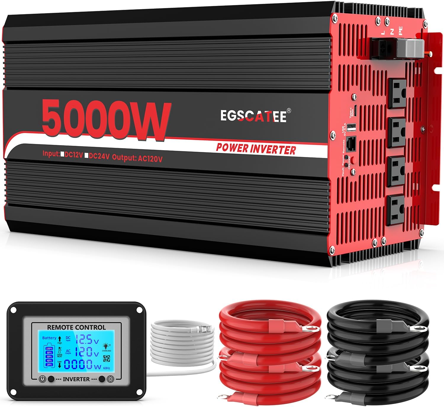 5000W Power Inverter 12V DC to 120V AC Converter for Truck, Home, RV, Peak 10000W Off-Grid Solar Power Inverter with 4 AC Outlets, USB Port,Type-C Port, Remote Controller with LCD Screen