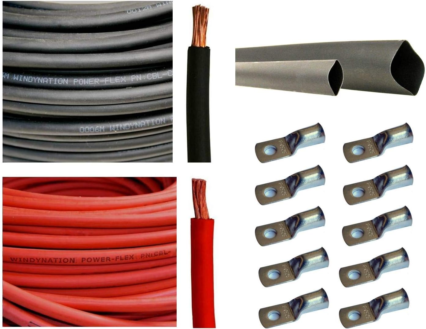 WNI 2 AWG 2 Gauge 25 Feet Black + 25 Feet Red Battery Welding Pure Copper Ultra Flexible Cable + 5pcs of 5/16" & 5pcs 3/8" Copper Cable Lug Terminal Connectors + 3 Feet Heat Shrink Tubing