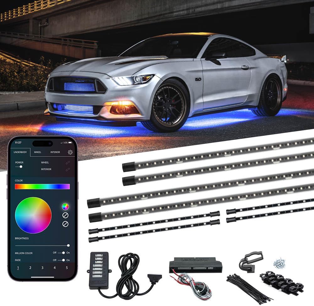 LEDGlow 4pc Bluetooth Million Color LED Underbody Underglow & 4pc Interior Footwell Accent Lighting Kit for Cars - Smartphone App - Courtesy Lights - Create Any Color - Control Box