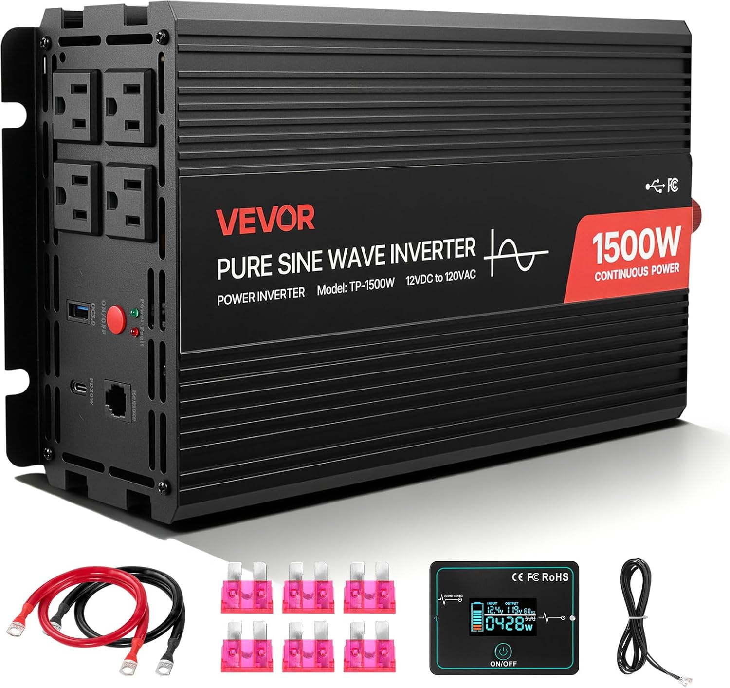 VEVOR 1500W Power Inverter, 12V DC to 120V AC Pure Sine Wave Inverter, Car Charger Converter with Remote Control, USB & Type-C Ports, 4 AC Outlets, Fast-Charging for RV, Truck Outdoor Camping