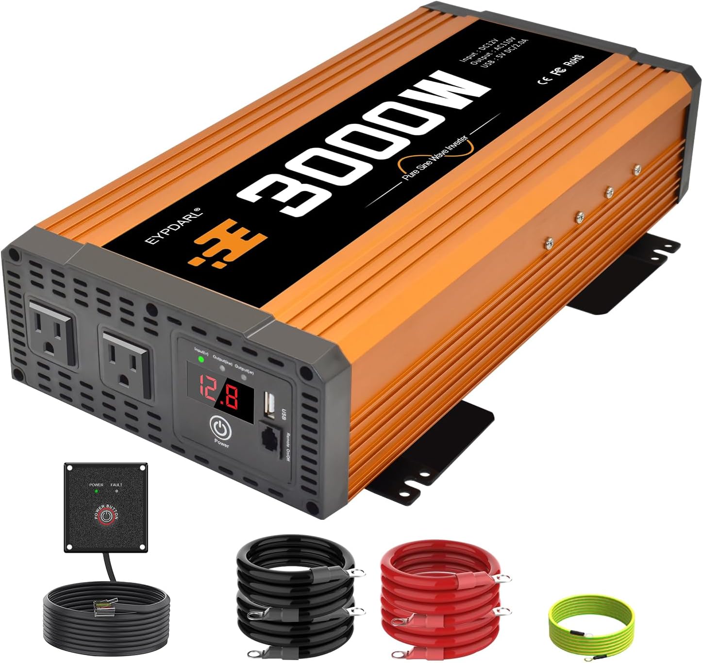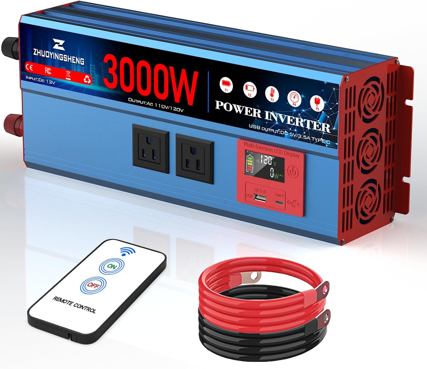 3000 Watt Inverter 12V DC to 120V AC Converter with LCD Display & Remote Control - 2 AC Outlets, USB 3.0 + Type-C Ports, Car Power Inverter Compatible with RV, Truck, Home, Off-Grid & Solar Systems