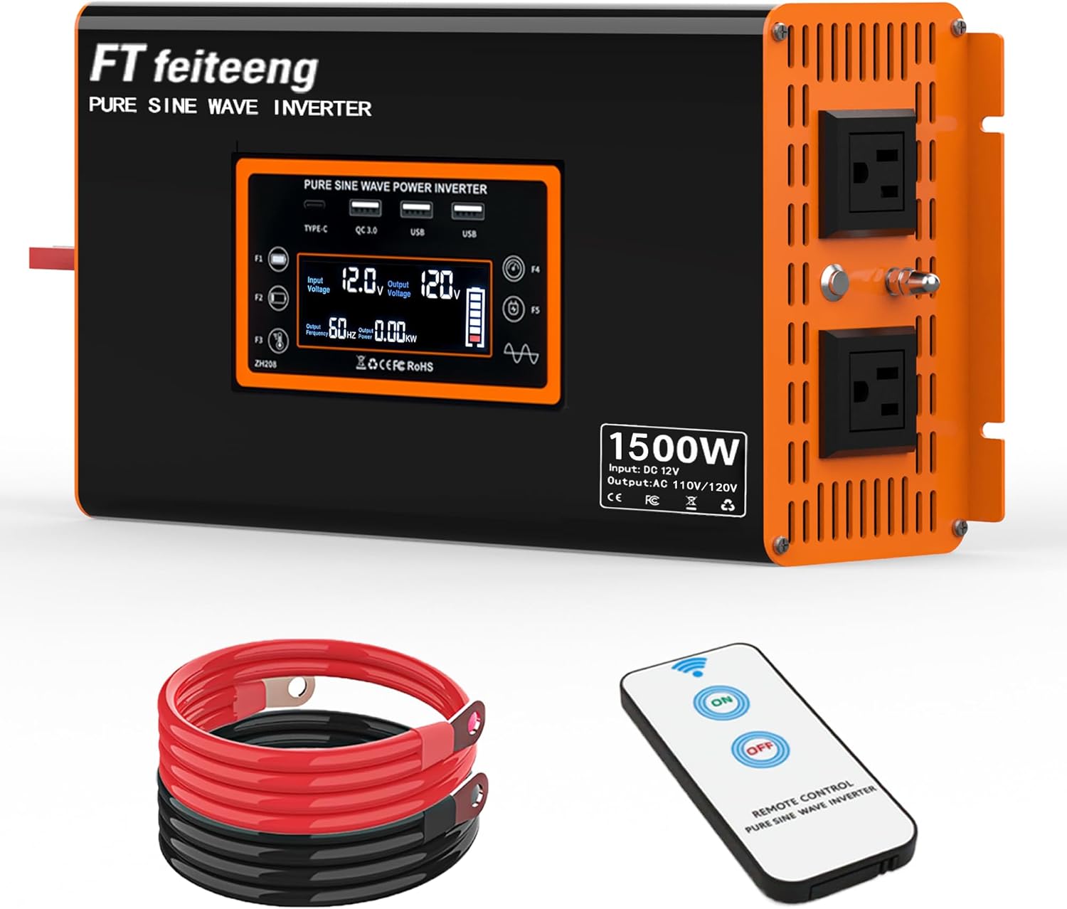 1500W Pure Sine Wave Inverter 12V to 120V AC, Solar Off-Grid & Outdoor Emergency Power, LCD Temp Control & Dual Fast Charger (RV/Truck/Camping)