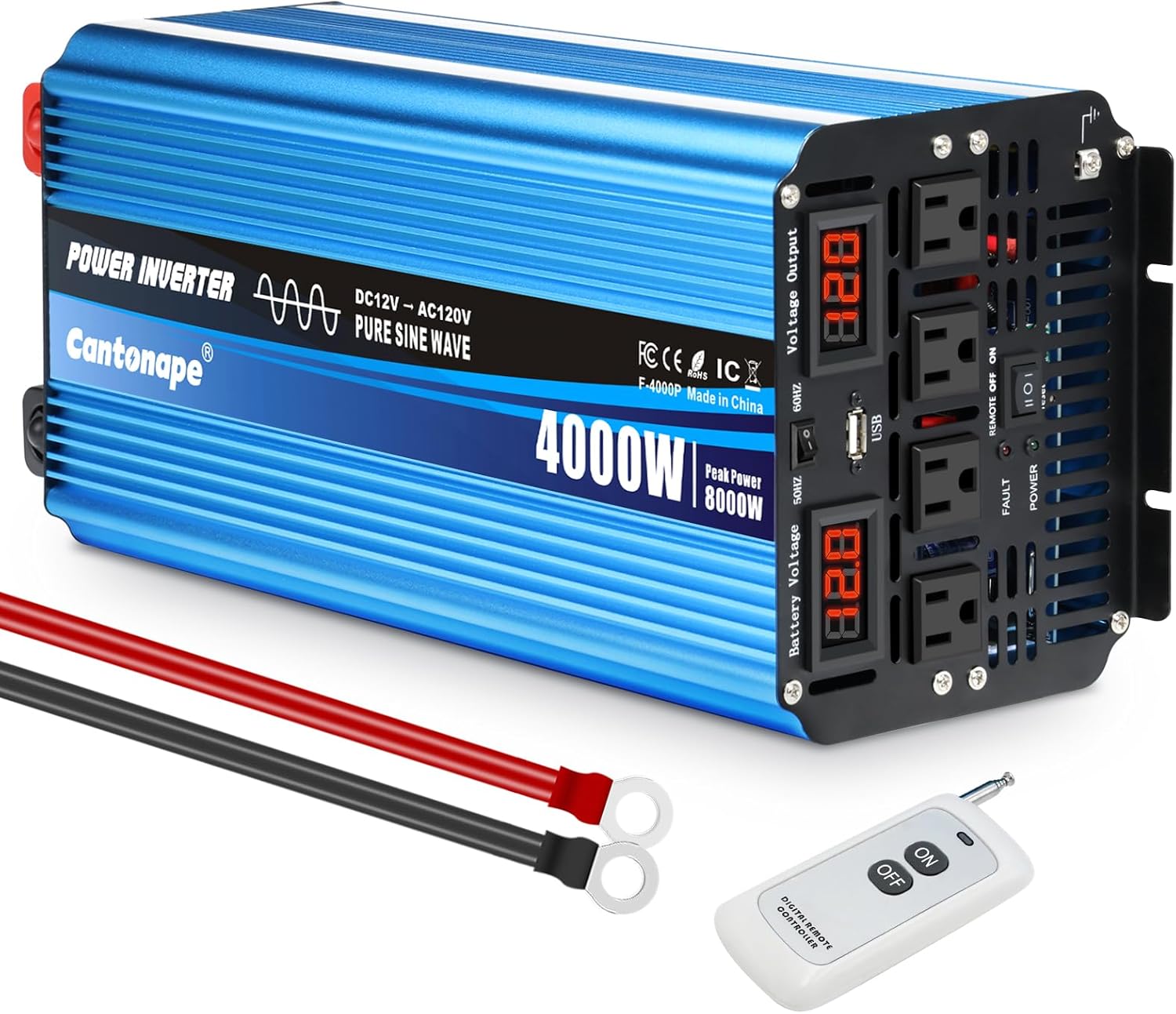 4000W Pure Sine Wave Power Inverter DC 12V to AC 110V 120V for Home RV with Dual AC Outlets 1 USB-C(60W) 3 USB-QC3.0 Fast Car Charger Adapter, LCD Display and Remote Control