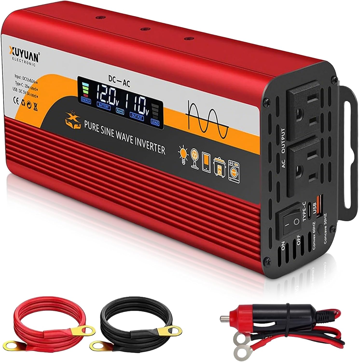 1000W Pure Sine Wave Inverter, 12V/24V Auto-Detect, 50Hz/60Hz Switchable, LCD Display, Type-C Fast Charging, Silent Design, Overload & Overheat Protection for RV, Home