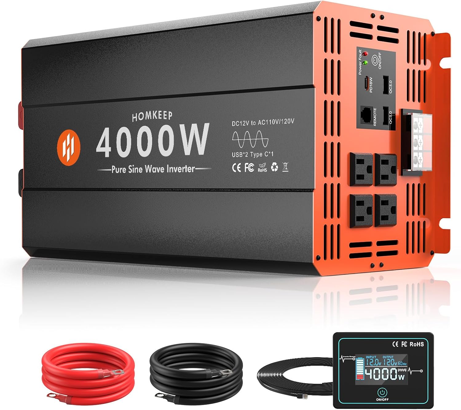 4000W Pure Sine Wave Power Inverter 12V DC to 110V AC Converter Peak Power 8000W for RV Truck Off-Grid Solar Car Inverter with 4 AC Outlets, 2 USB & 1 Type-C Ports, Hardwire Kit, Remote Controller