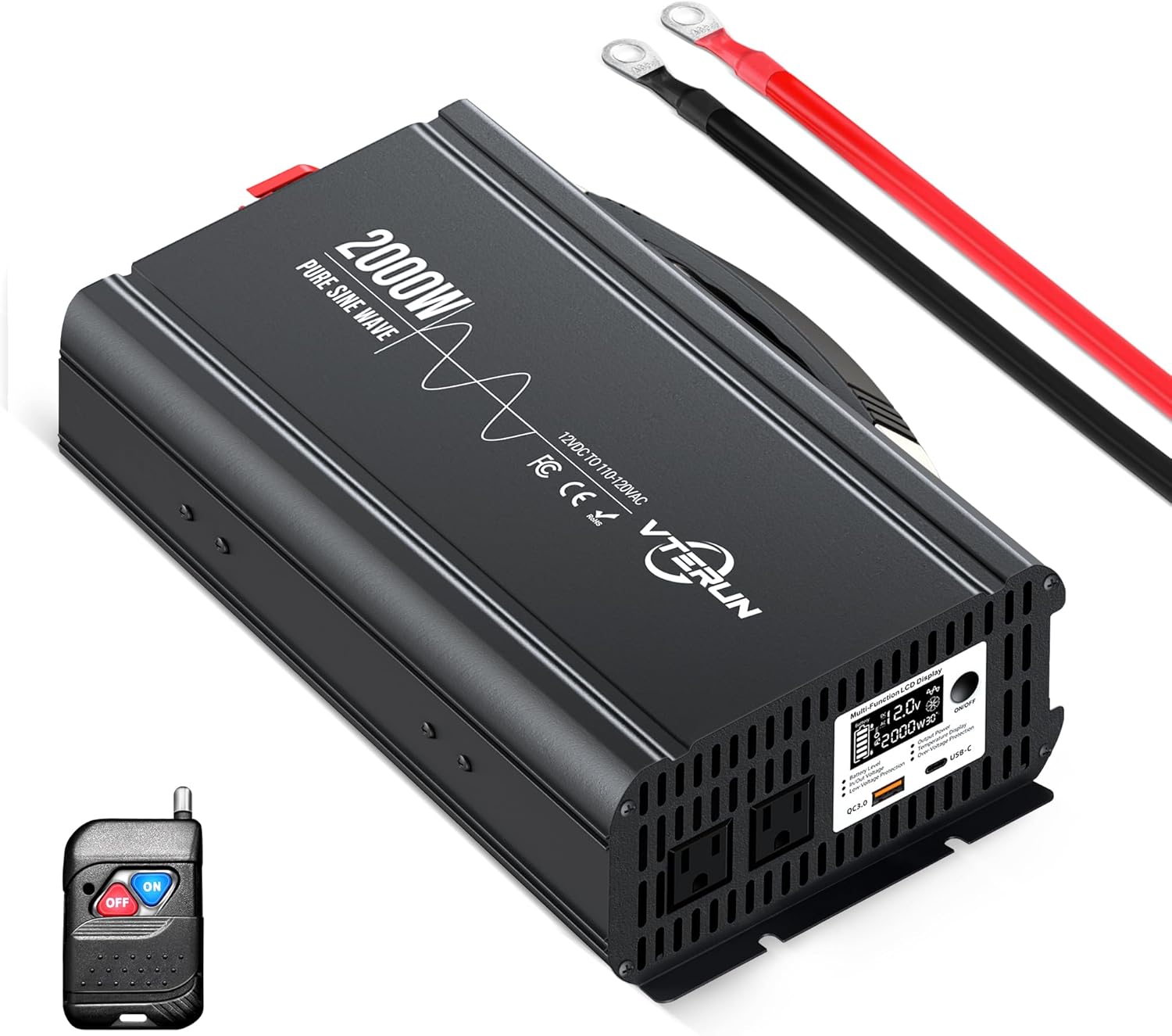 2000W Pure Sine Wave Inverter 12V DC to 110-120V AC Efficient Energy Converter for Home, RV Use with APP Wireless Remote Control with USB C Ports