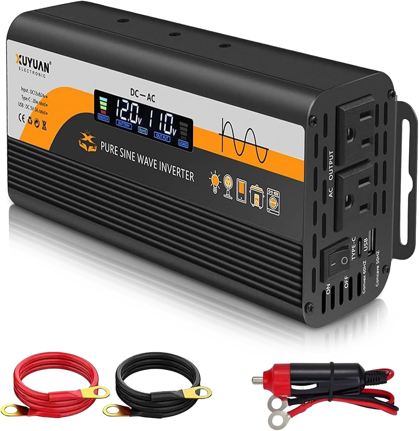 1000W Pure Sine Wave Inverter, 12V/24V Auto-Detect, 50Hz/60Hz Switchable, LCD Display, Type-C Fast Charging, Silent Design, Overload & Overheat Protection for RV, Home
