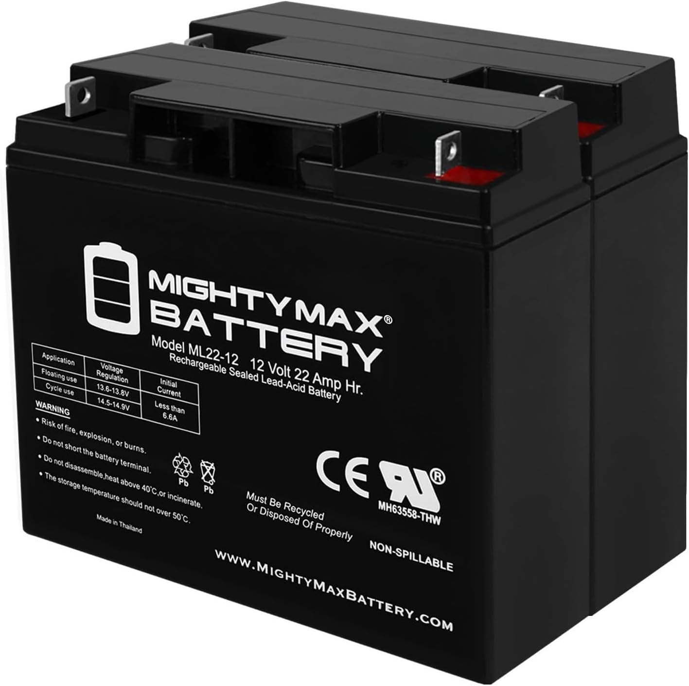 Mighty Max Battery ML22-12 - 12 Volt 22 AH, Nut and Bolt (NB) Terminal, Rechargeable SLA AGM Battery - Pack of 2
