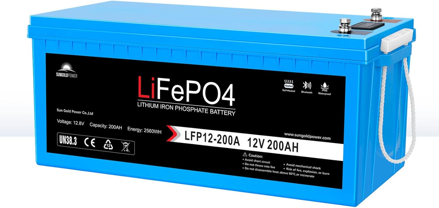 SUNGOLDPOWER 200AH 12V LiFePO4 Battery Built-in 200A BMS, 2560Wh Power, 4000+ Deep Cycles Lithium Battery with Bluetooth, IP65 Waterproof, Self Heating,for RV, Marine, Off-Grid System