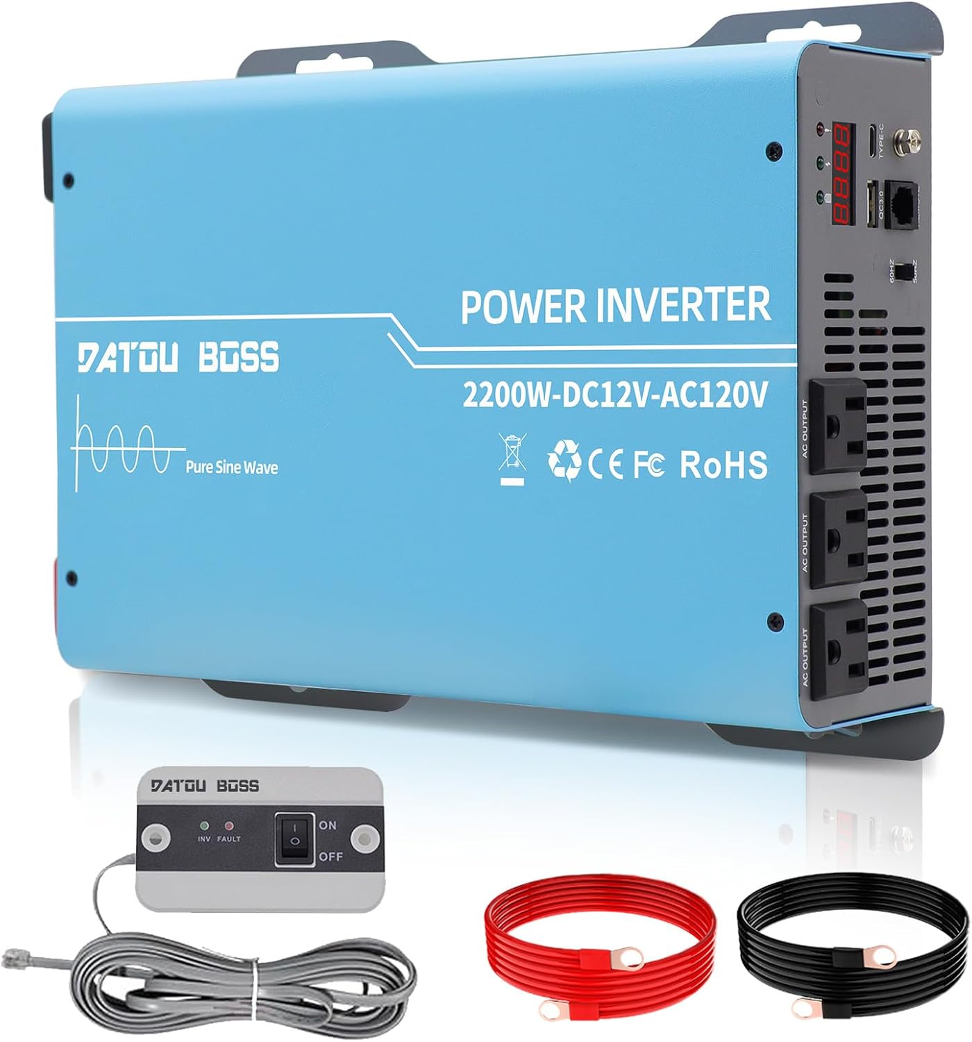 DATOUBOSS 2200w Pure Sine Wave Inverter 12V Car Power Inverters 12V DC to 110V 120V AC Inverter Converter, Peak 4400W with Dual AC Outlets and USB & Type-C for Car, RV, Home, Truck, Off-Grid Solar