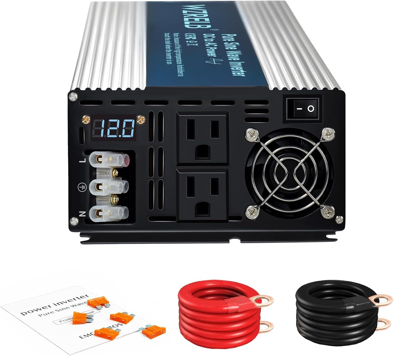 WZRELB 3000W Pure Sine Wave Inverter 12V DC to 110V 120V AC Power Converter with LED Display, Hardwire Terminal,Off-Grid Portable Power Inverter with Dual AC Outlets for Home, RV, Truck, Camping