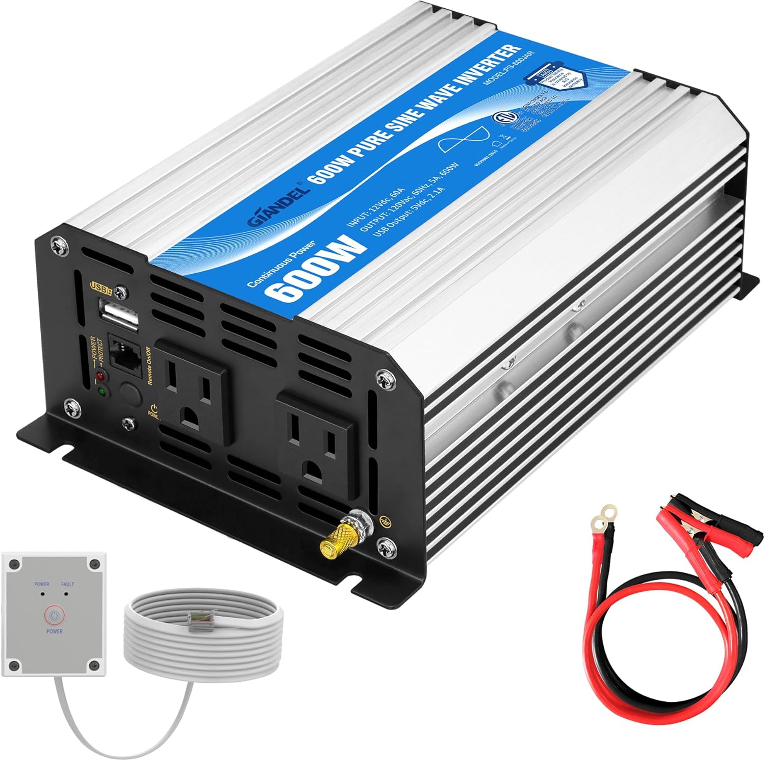 GIANDEL Power Inverter Pure Sine Wave 600Watt 12V DC to 120V AC with Remote Control Dual AC Outlets ETL Listed UL458 Standard for Small Solar System Outdoor Emergency
