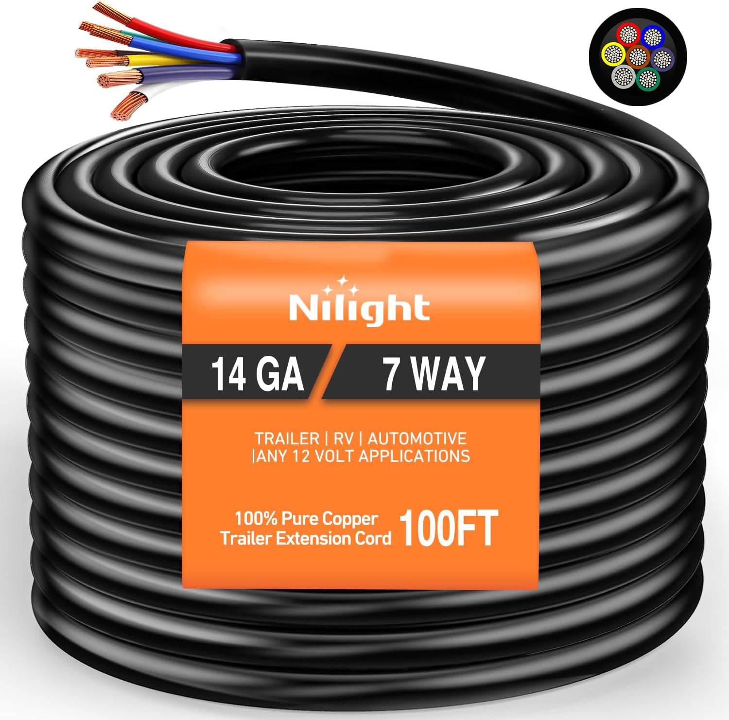 Nilight 100 Feet 7 Way Trailer Extension Cable Traditional SAE 14 Gauge 7 Conductor 100% Pure Copper Wire Insulated Heavy Duty Cord Weatherproof for 7 Pin Blade RV Automotive