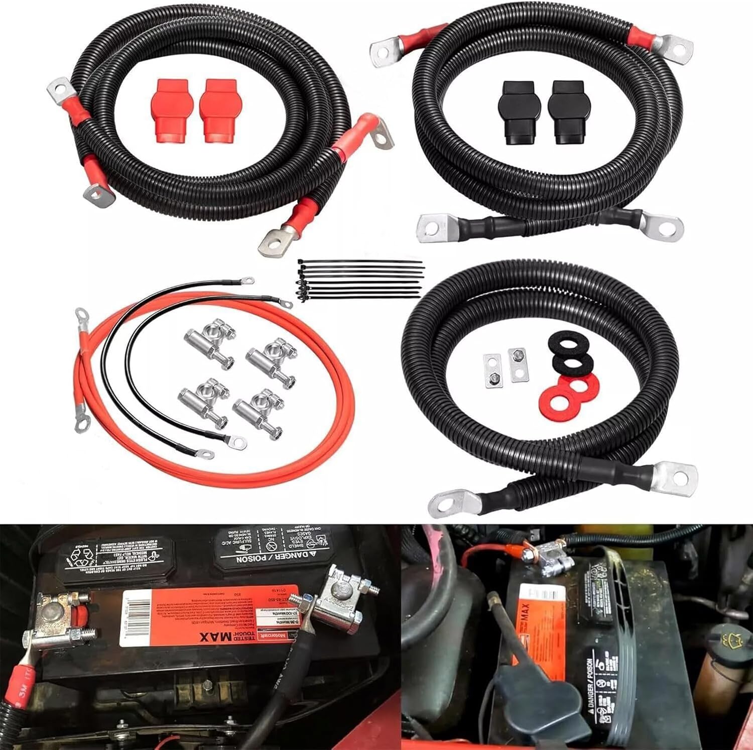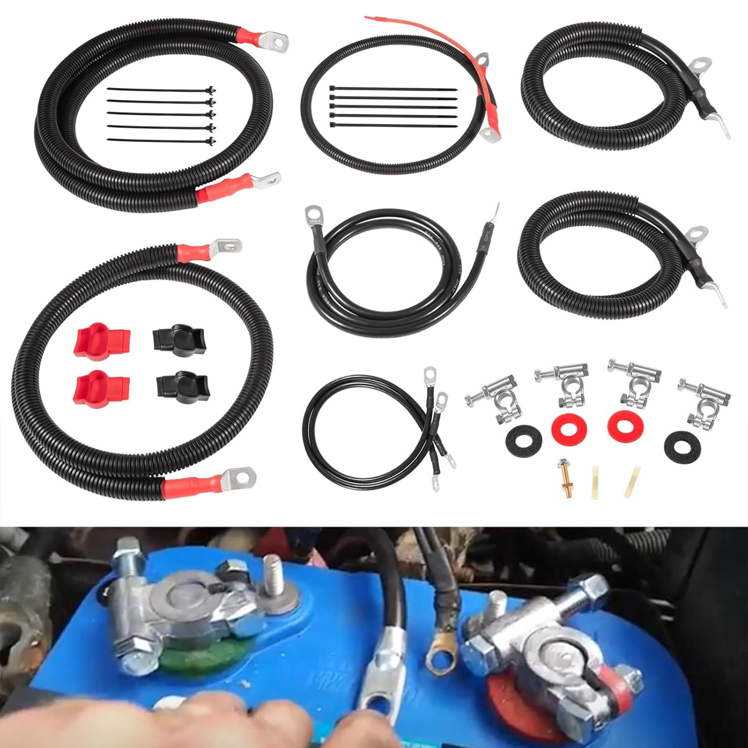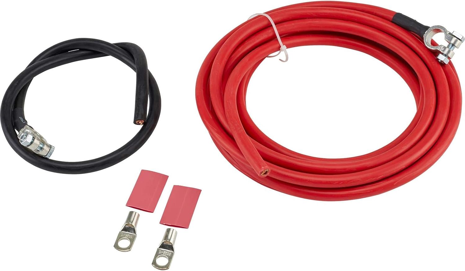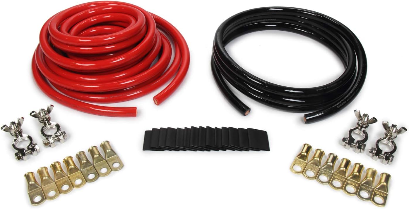 2-Gauge Battery Relocation Cable Kit, 18 Ft Red Positive & 2 Ft Black Negative Copper Cables, Pre-Crimped Terminals, Ring Terminals, Heat Shrink, E-Z Ties, For Trunk Mount