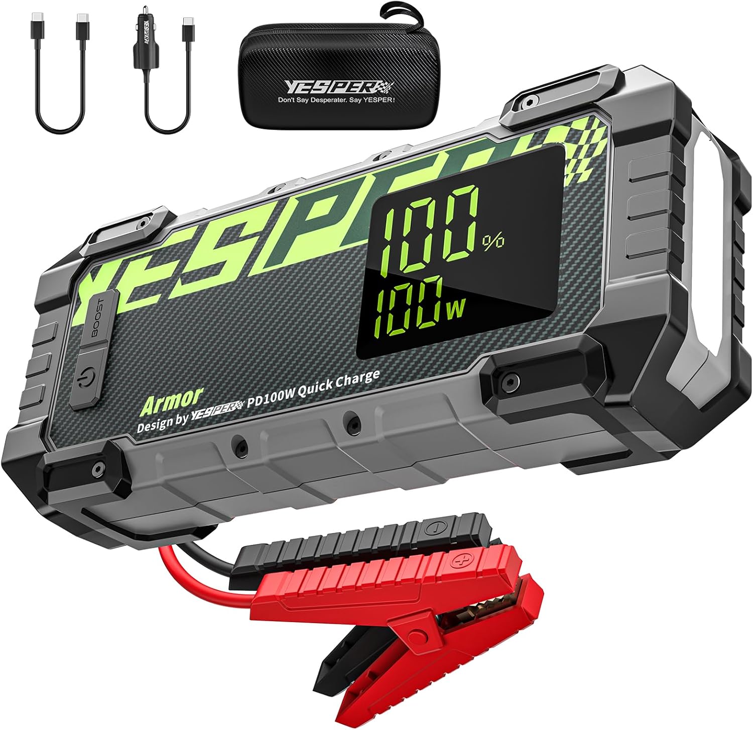 YESPER 4000A Jump Starter, 12V Car Battery Jump Starter 24000mAh Power Pack, (All Gas/10L Diesel Engine) Portable Jump Starter for Car with 100W Quick Charge Cables,Booster, LED Light - Armor Series