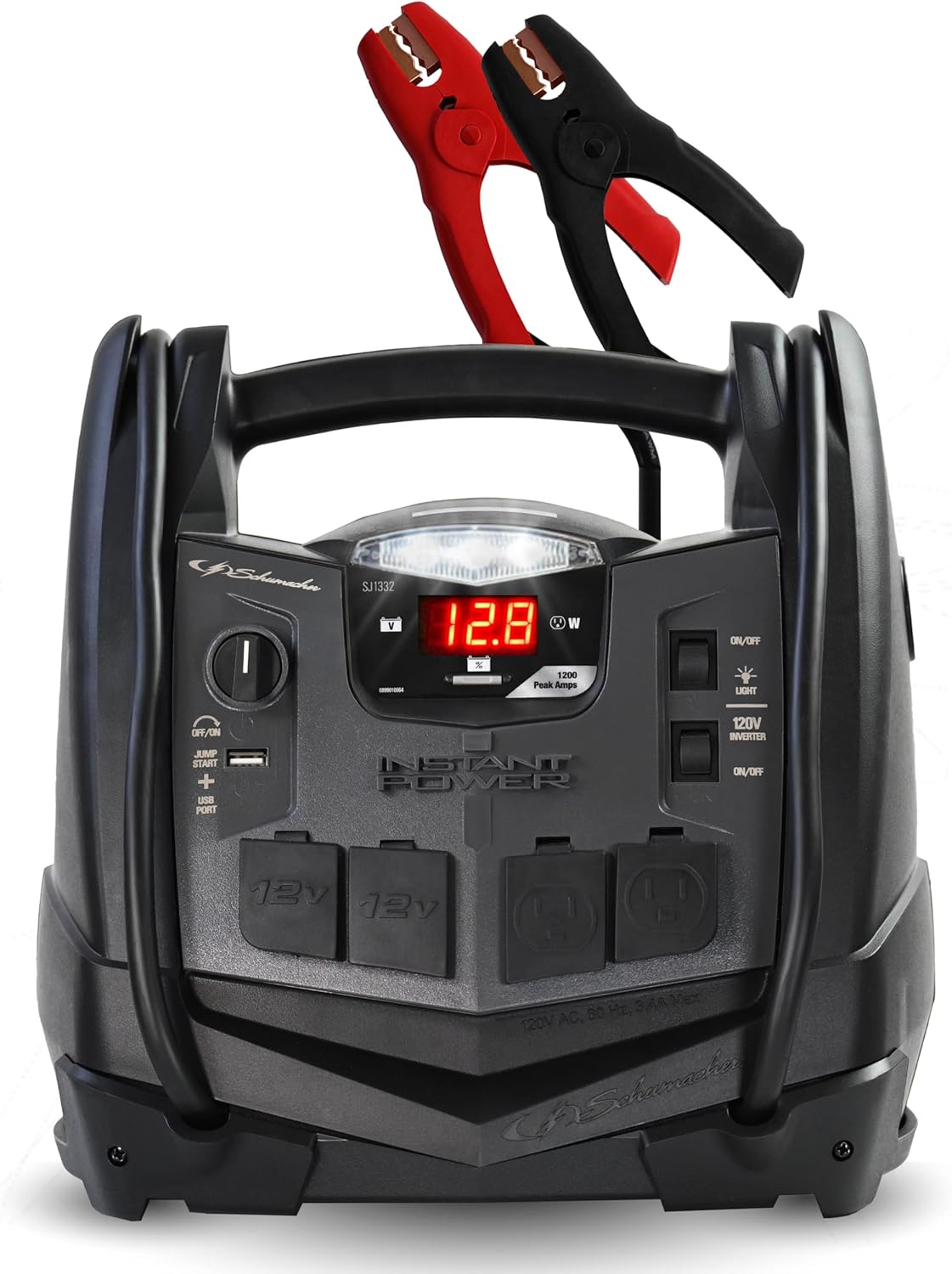 Schumacher Electric 1200A Car Battery Jump Starter and Portable Power Station, 6-in-1 Solution for 12V Batteries, 150-PSI Air Compressor, 200 Continuous/400 Peak Watt Inverter, SJ1332