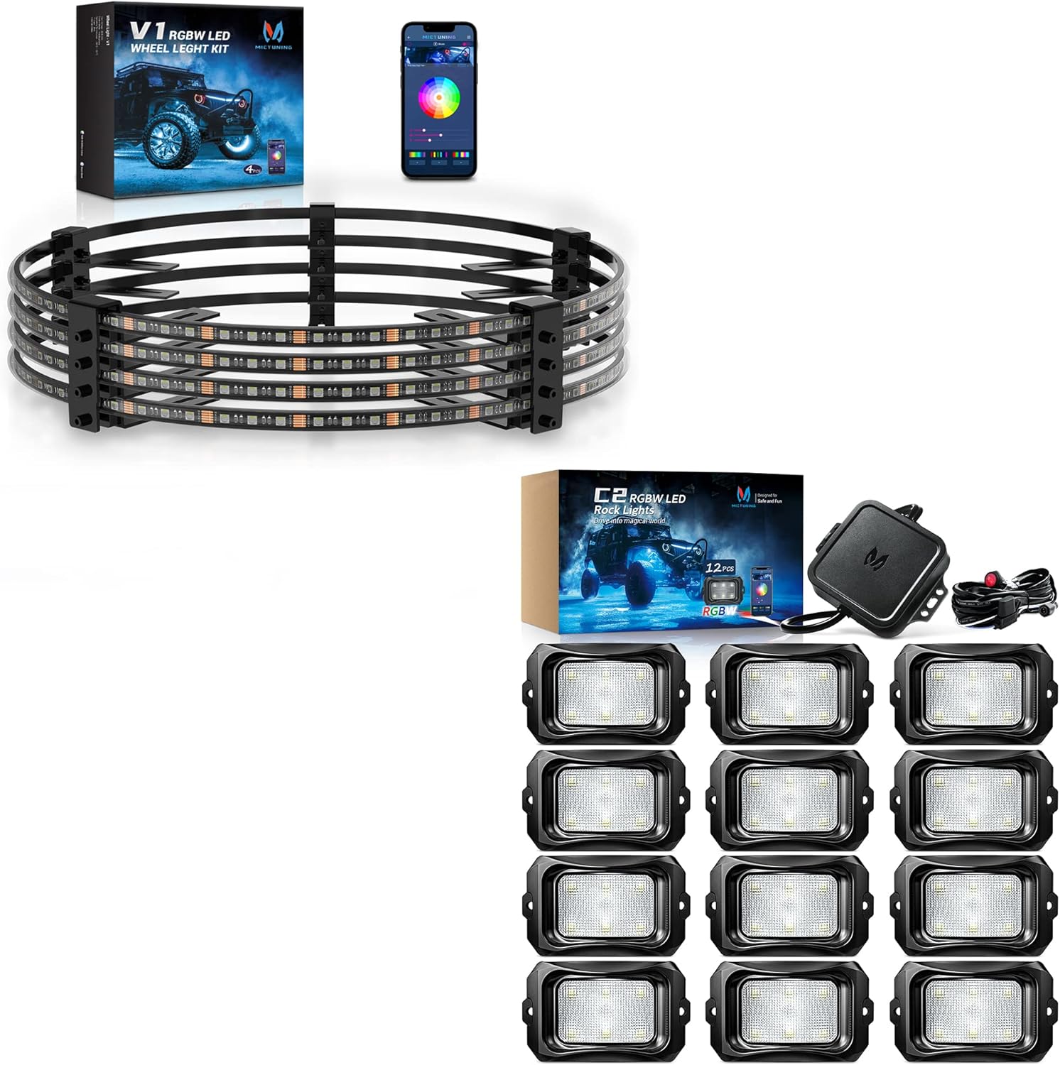 MICTUNING 12 Pods C2 Curved RGBW LED Rock Lights Bundle with 17.5'' V1 RGBW LED Wheel Ring Lights Kit