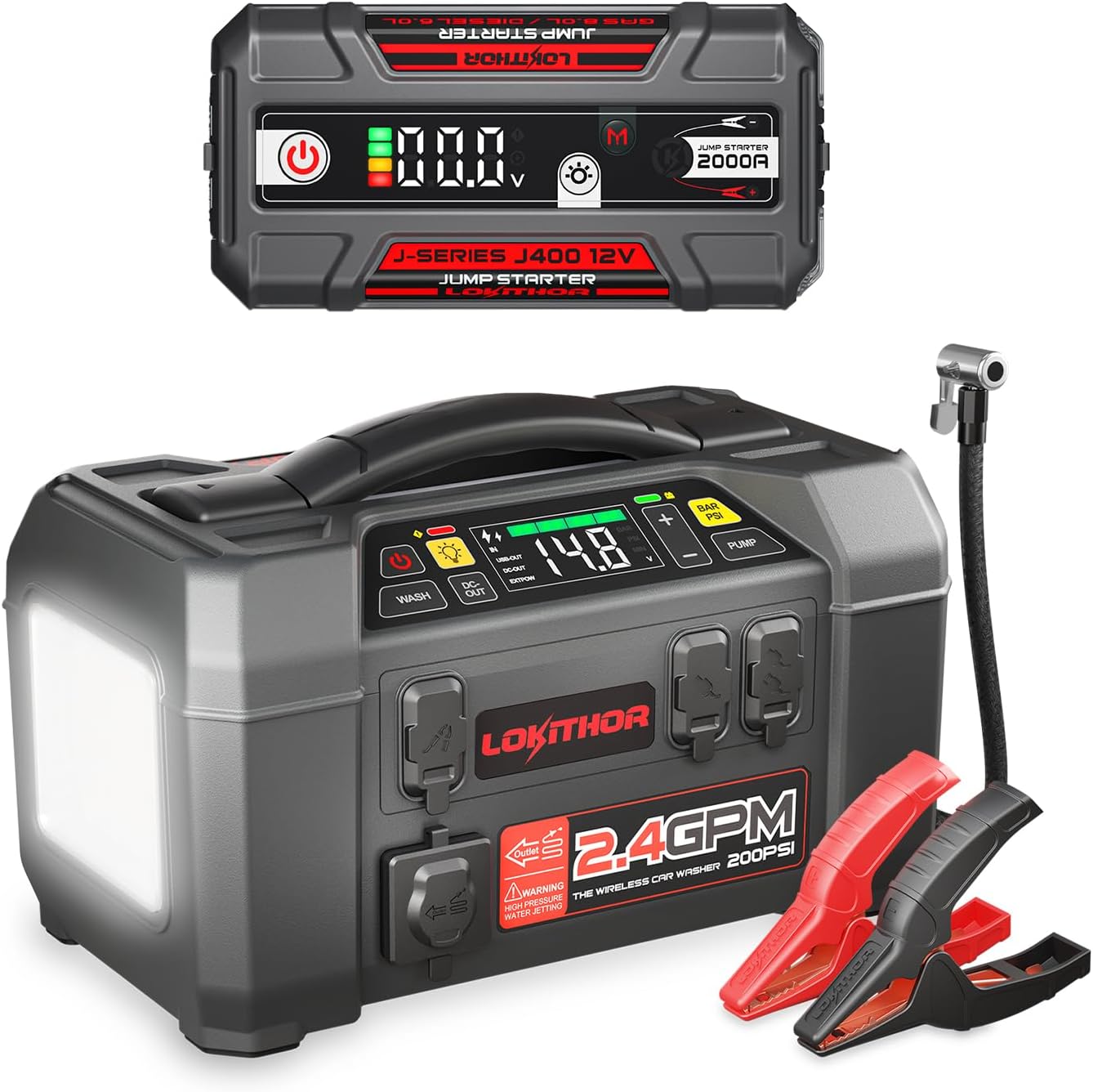 LOKITHOR J400 2000 Amp 12 Volt Portable Car Jump Starter and AW401 2500 Amp 12 Volt Battery Jump Starter Pack with 200PSI Cordless Pressure Car Washer, 150PSI Tire Inflator