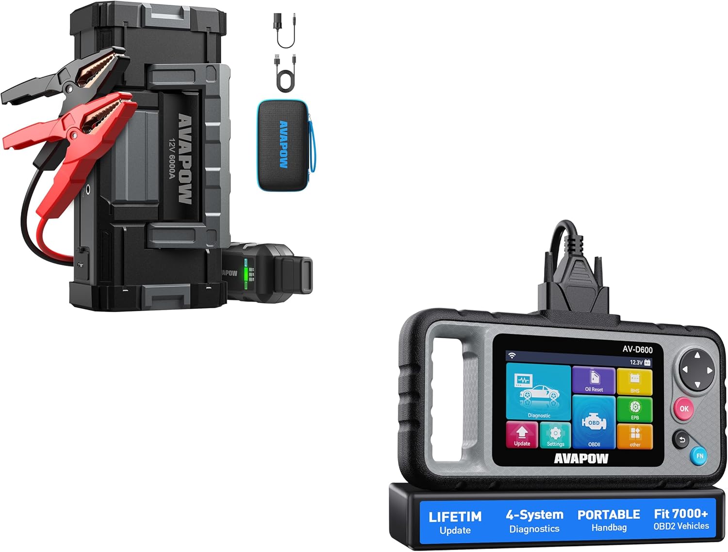 Avapow A58 Jump Starter 6000a with Avapow 2025 4-System Diagnostics Obd2 Scanner