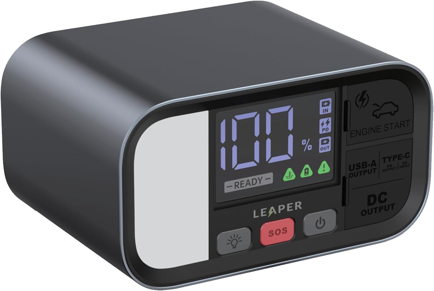 Leaper 12V Jump Starter, Black Aluminum Casing, 2000A Peak Current, 20000mAh Capacity, 3'' Digital Screen, Non-Polarized Green Clamps. Protective Carrying Case and a UL PD65W Preminum Charger