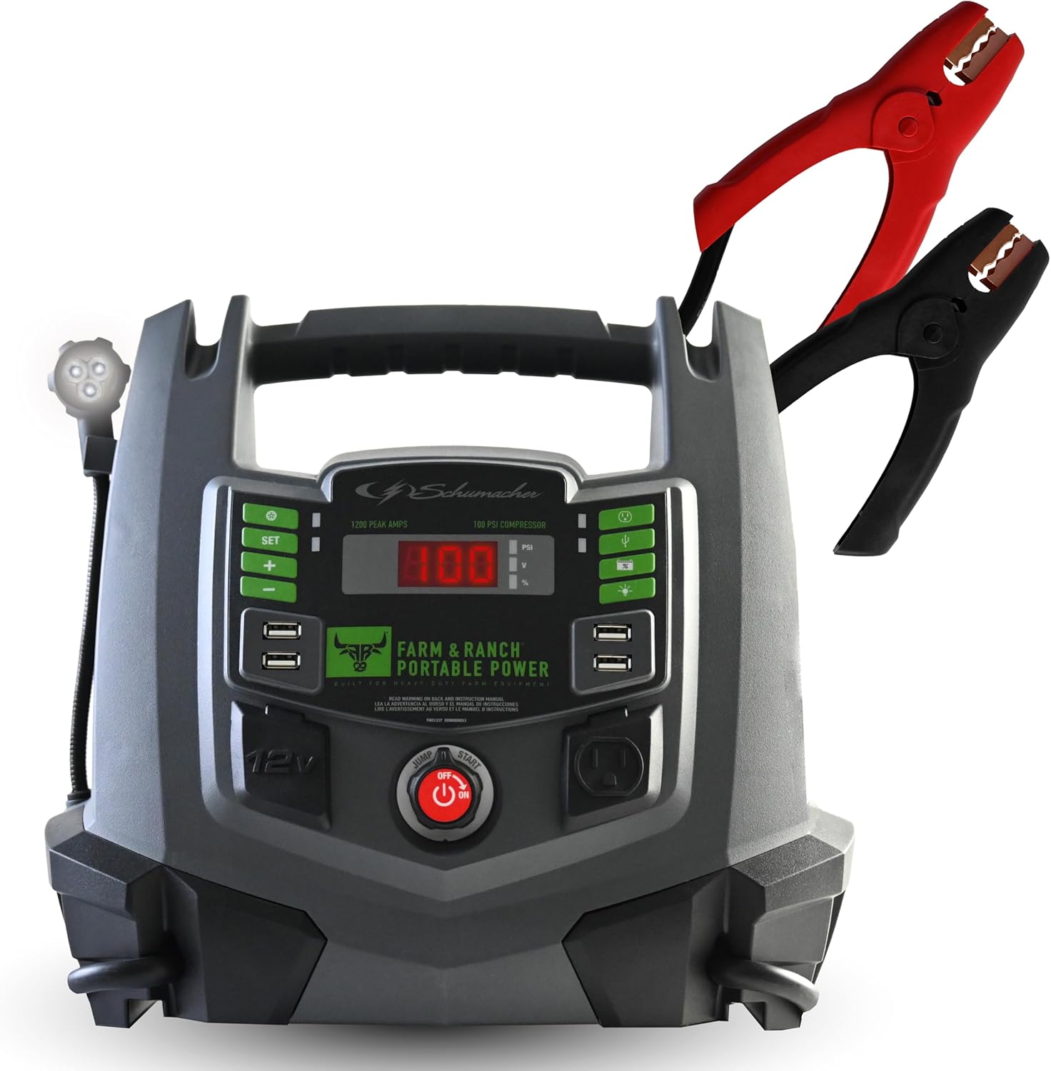 Schumacher Electric Farm & Ranch 1200A Car Battery Jump Starter and Portable Power Station, 5-in-1 Solution for 12V Batteries, 100-PSI Air Compressor, 200 Continuous/400 Peak Watt Inverter, FR01337