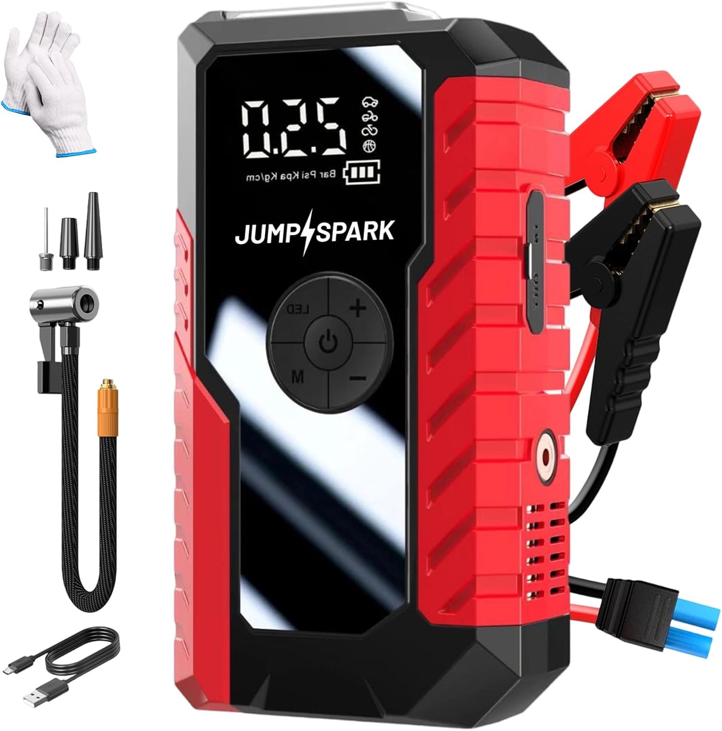 Jump Spark Starter, Jump Spark 4 in 1, Portable Car Battery Jump Starter with Air Compressor, Tire Inflator Portable Air Compressor, with USB Ports, Jumper Cables, LED Light, Storage Case (1 PCS)
