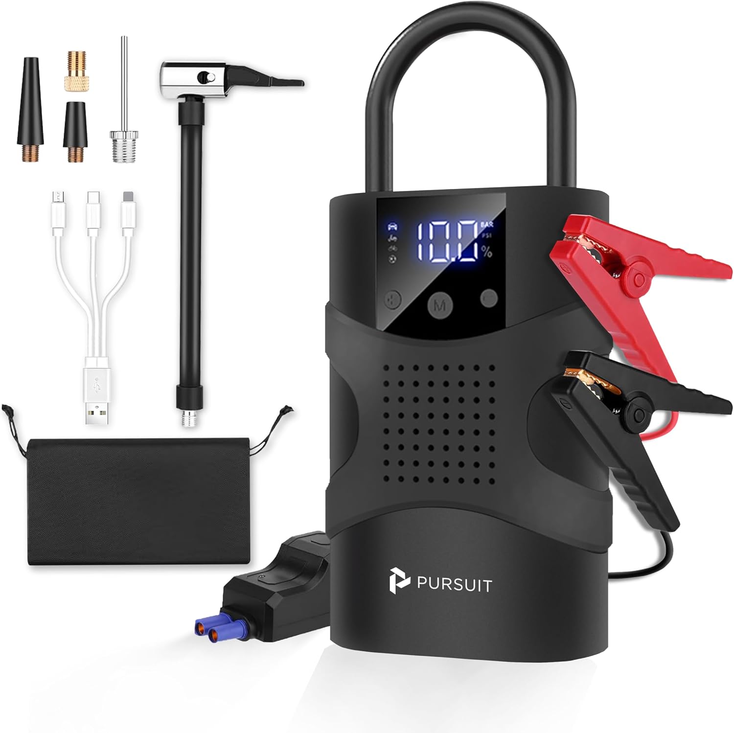 Pursuit Jump Starter with air inflator, 2000A Jump Starter with 150 PSI Air Compressor Tire Inflator, 4 in 1 car Tool, 8000mah Power Bank, LED Flashlight, for 8.0L Gasoline and 6.0L Diesel Engines