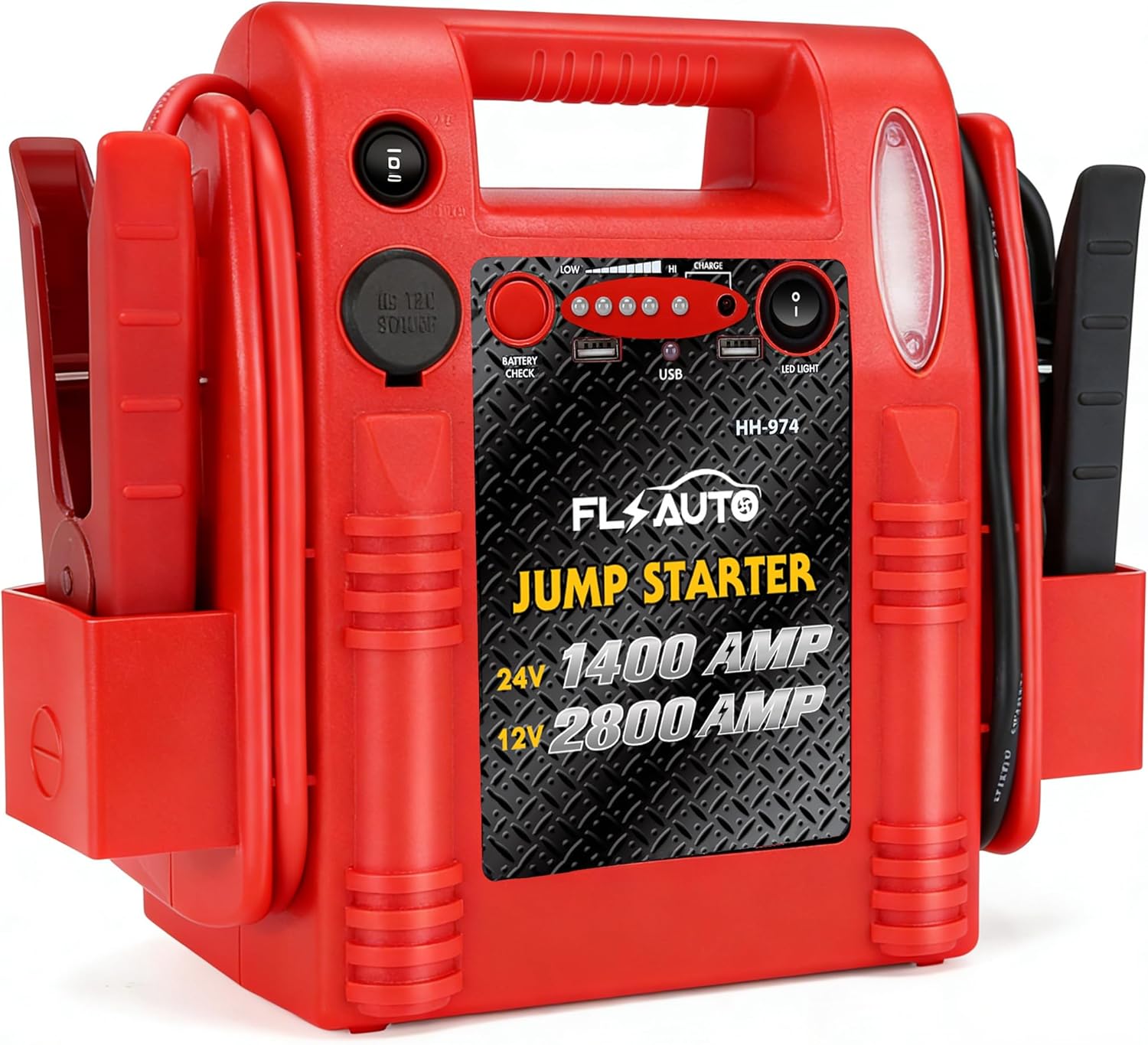 Car Battery Jump Starter - FlyAuto 2800/1400 Amp 12V 24V Heavy Duty Jump Box, Works with Truck Tractor Excavator Automotive Engine Starter Battery Charger Booster Jumper Box with USB/DC Power Unit