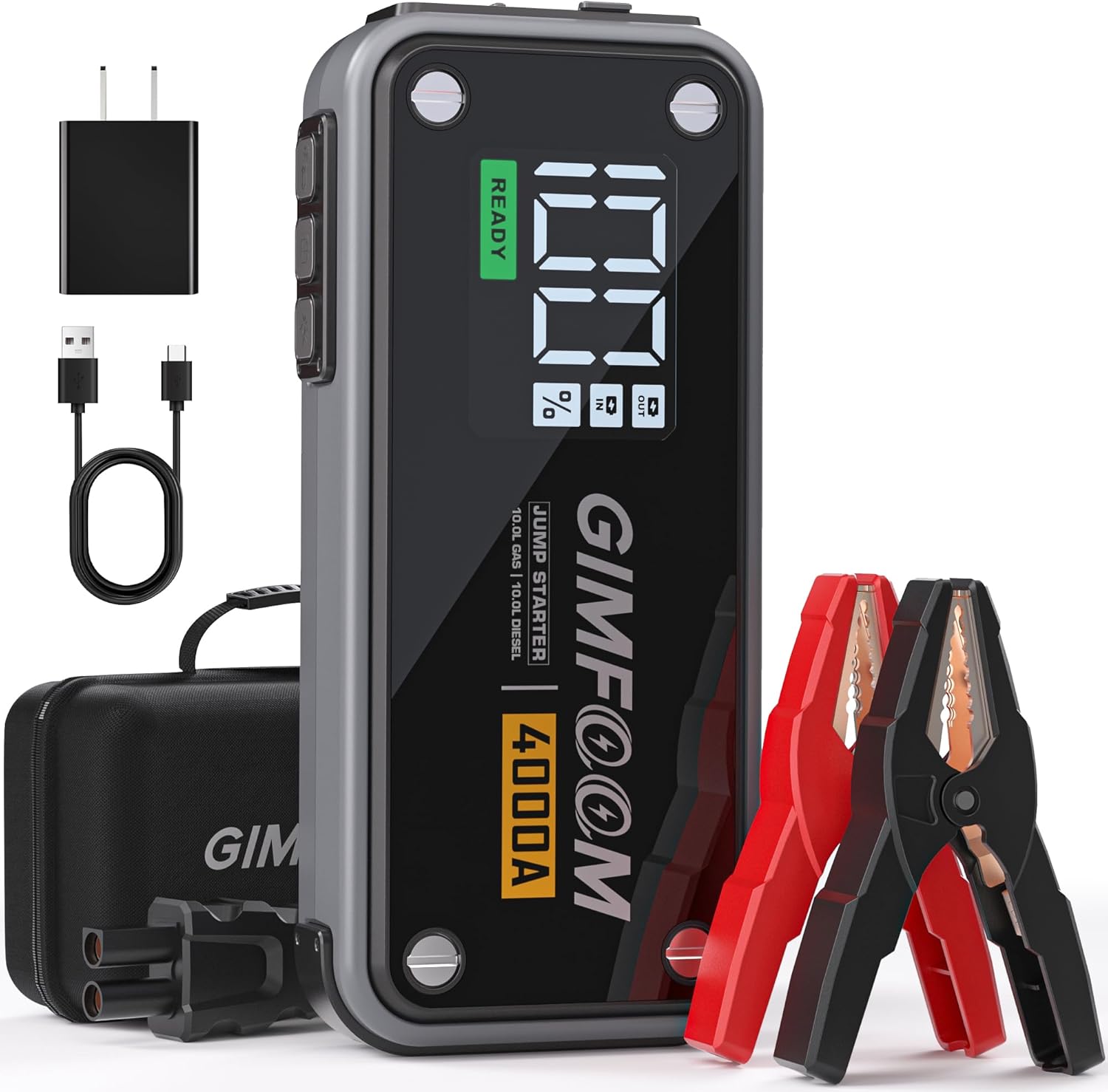 Jump Starter, 4000A Car Battery Jump Starter with Wall Charger (10L Gas & 10L Diesel Engines), 12V Jump Starter Battery Pack with 3.4 Inch Smart Display, Jump Box with 400 Lumens LED Light