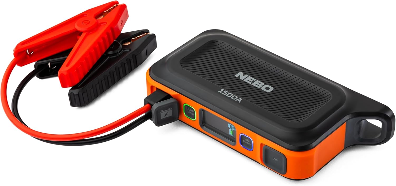 NEBO 1500A Portable Car Battery Jump Starter | 29.9Wh Power Supply Jump Box Restarts 12V Trucks & SUVs, 30 Battery Boosts from 1 Charge, Integrated Emergency Floodlight, USB Ports, TSA Approved