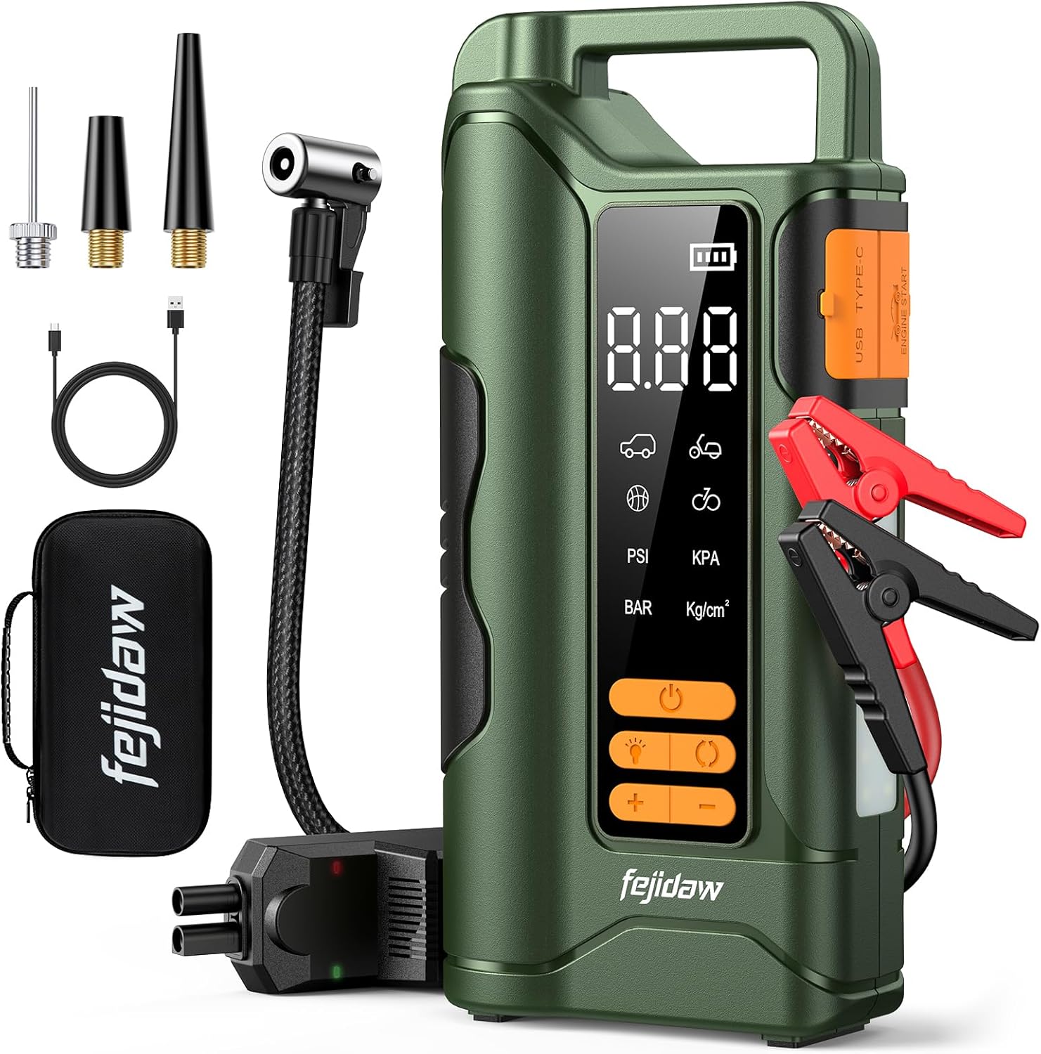 Pelsee 3500A Jump Starter with Air Compressor, 20000mAh Portable Car Battery Jump Starter, 45W Fast Charge, 12V Battery Pack(10L Gas 8L Diesel Engine)with Tire Pressure Monitor, Light,Jumper Cables,E1