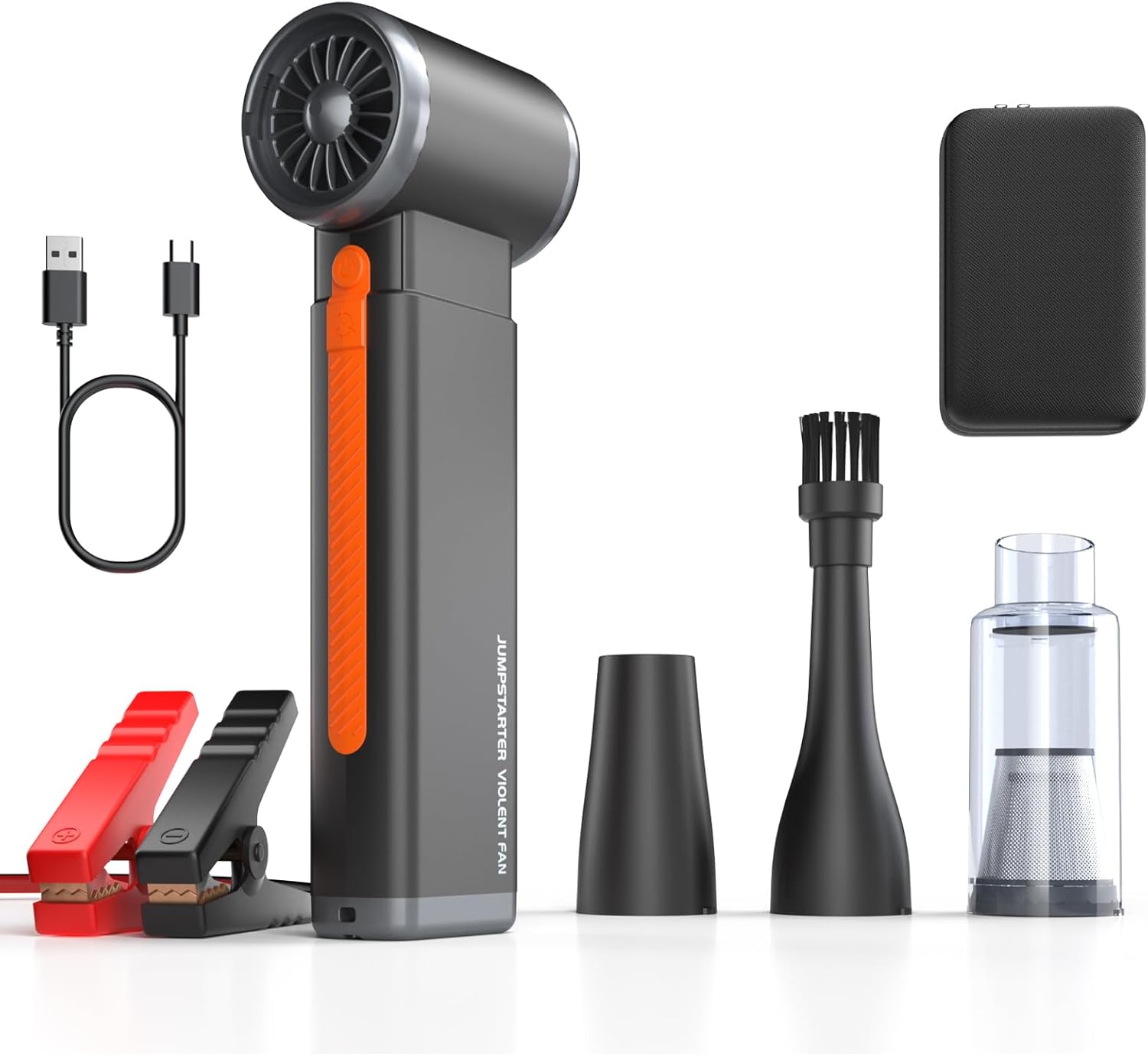 Portable Car Battery Jump Starter 6000A Jumper Box Combo Compressed Air Duster & Vacuum Cleaner Function, 12V Battery Charger Booster Power Pack with Turbo Fan, 3-Speed Blower for Snow/Leaves/Dust