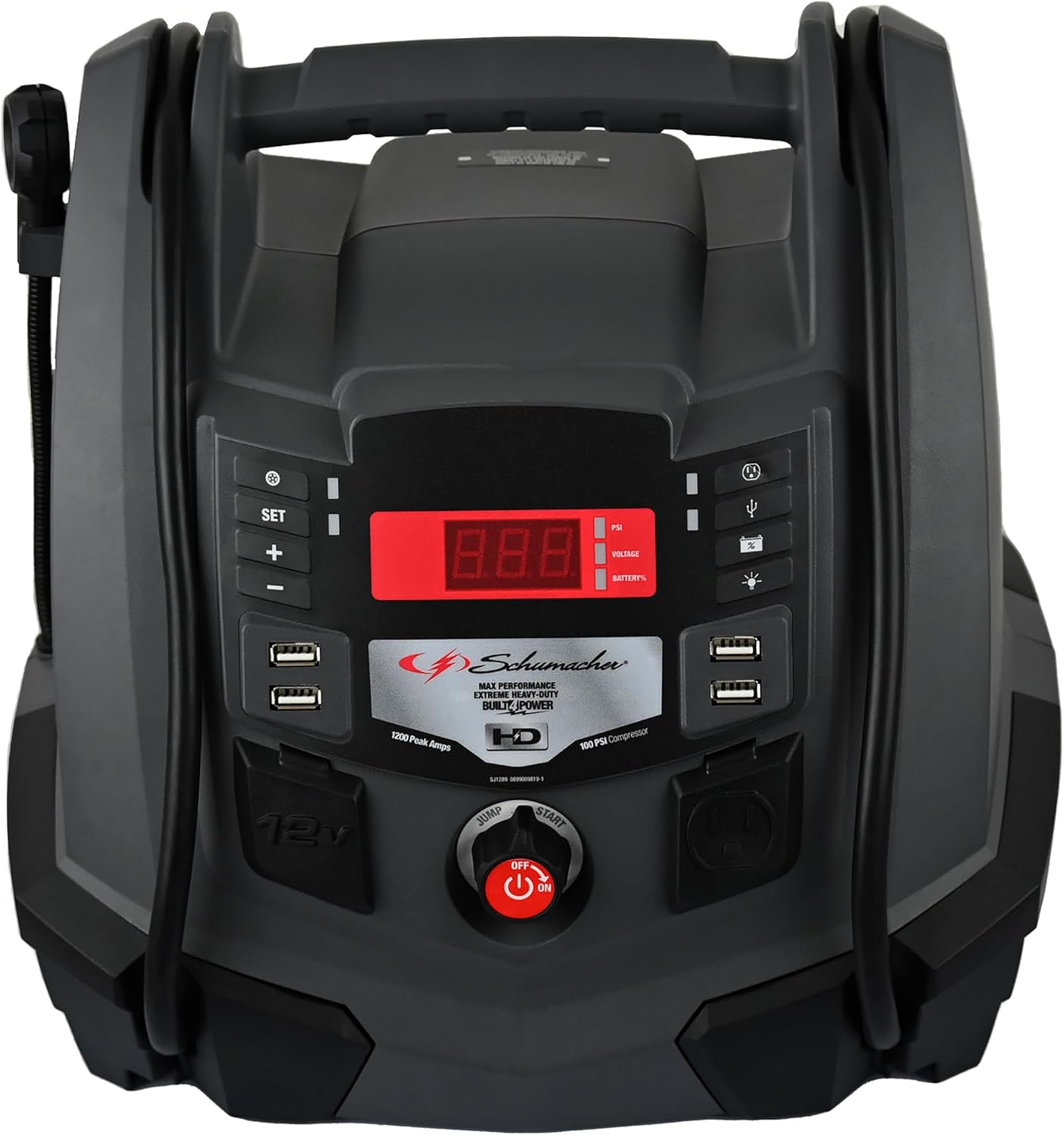 Schumacher Electric Jump Starter and Portable Power Station, SJ1289, 5-in-1, 1200 Peak Amps, 12 Volts, 100-PSI Air Compressor, 200 Continuous Watt Power Inverter, 6 Outlets - DC, AC and USB